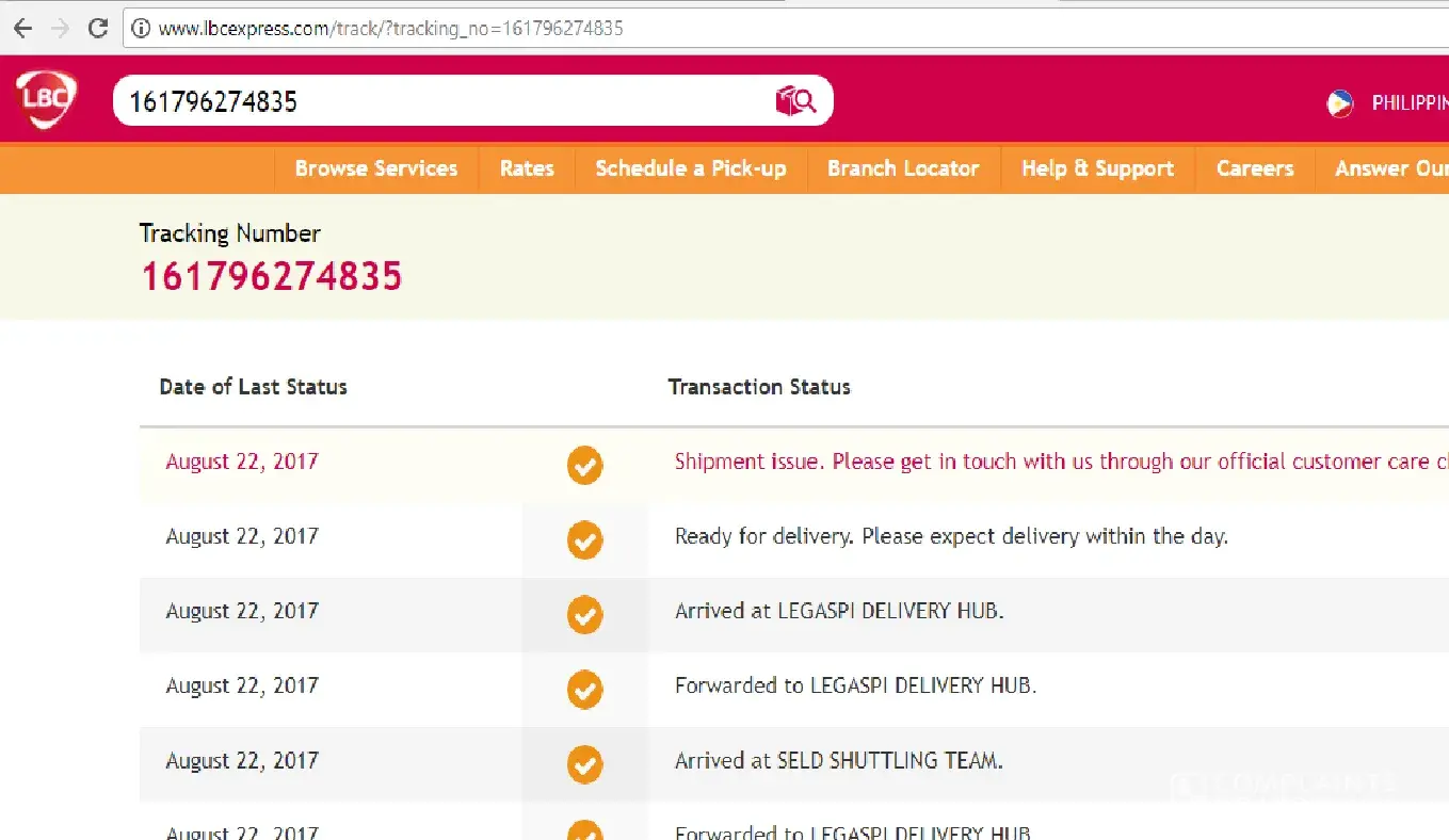 I was tracking the package I sent thru LBC to Polangui, Albay. August 28, 2017 it says it is ready for delivery and expect the the delivery within the day so I asked my Mom from Bicol to wait. The same day, it was tagged, Shipment issue. What is the exact issue? Can you tell me where the package is? Don't tell me that there is no LBC near the area because this is not the first time I sent a package from Ilocos Norte to Polangui, Albay (Bicol). Send me email for update. [protected]@gmail.com