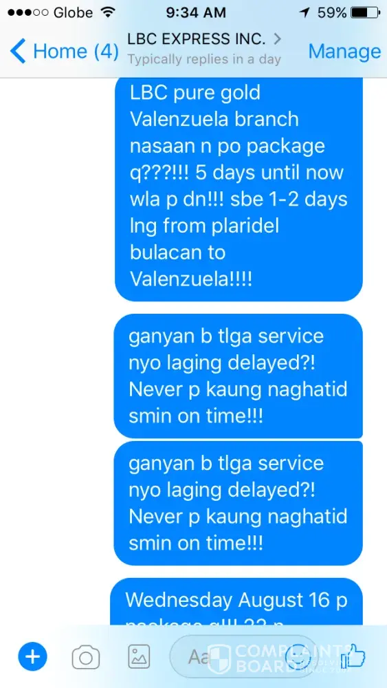 Magsara n kau! Never on time! Always delayed! Until now wla p dn package q kla mo nmn galing inbg bansa s sobrang tagal! Eh galing lng nmn bulacan to Valenzuela! Mahiya nmn kau taas ng singil nyo pro bagsak nmn service nyo! Mga sinungaling p kau! Kya nga nagLBC pra ndi n mahirapan pumunta at magdala ng package kso dpat pla ndi n lng baglbc sna nand2 n ngaun package q! Door to door nga db bkit kelangan qng pumunta s office nyo! Binayaran kau ng tama kya magtrabaho kau ng tama!