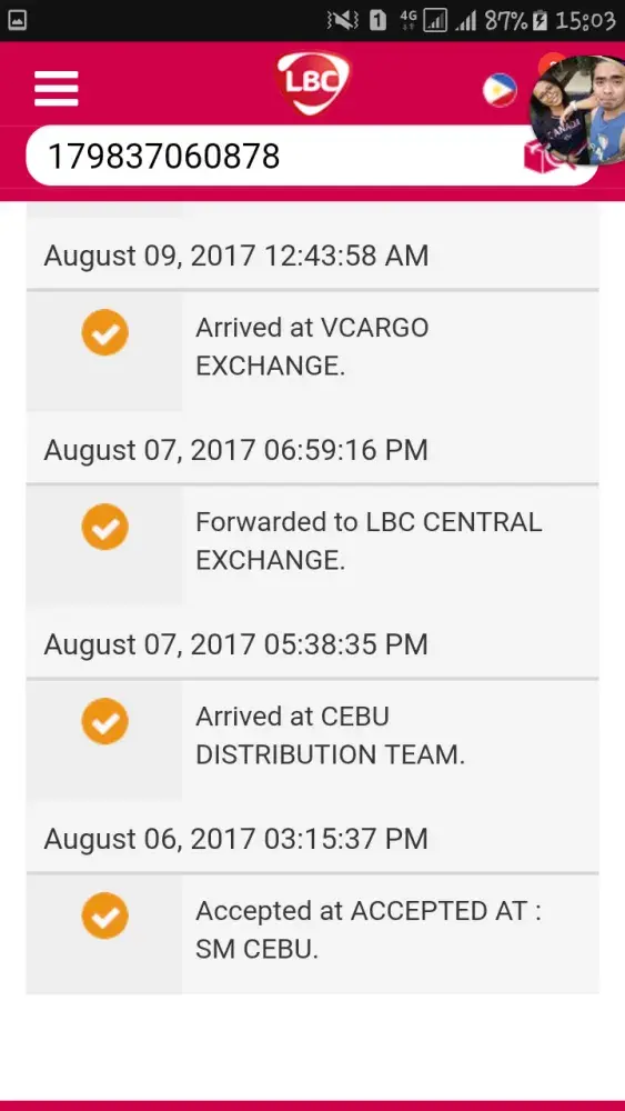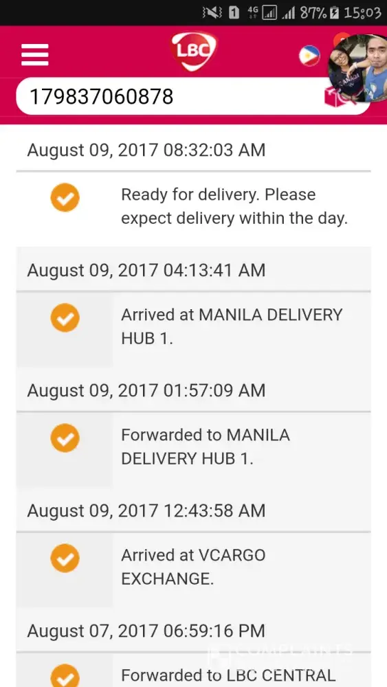 Date of Last Status Transaction Status August 14, 2017 Your shipment was not delivered since recipient's address is out of LBC's service area. Please get in touch with us through our official customer care channels. August 14, 2017 Ready for delivery. Please expect delivery within the day. August 14, 2017 Arrived at DAGUPAN DELIVERY HUB. August 14...