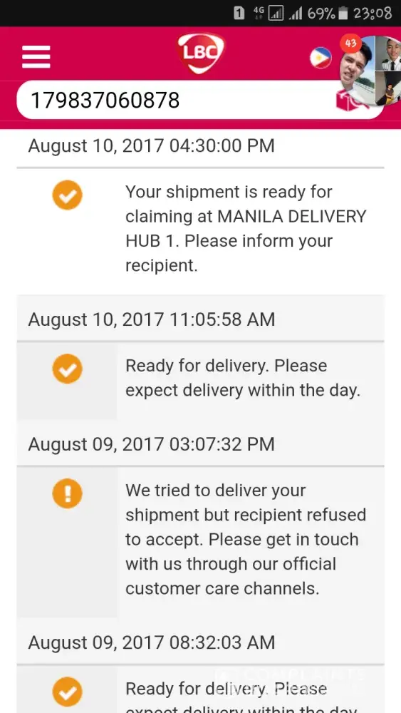 Good day. . I have been expecting my delivery's arrival since yesterday. I tracked the delivery through lbc tracker and it says it has already arrived yesterday, August 11, 2017. I waited but nothing came. This morning i checked back the tracker and there was this issue that says the recipient name is unknown to the said address. I got so concern that my residence is known through my last name when I was still single because I am still living at my parent's house. My middle name is MALIC and the whole barangays know my house as Malic's residence instead of my last married name. I tried to call the warehouse's three contact numbers here in iloilo for hundreds of times but no answer was given. Their phones were ringing but no one's answering. There was this one contact number that answered my call then suddenly dropped it. I got so pissed that i wanted to help them solve the issue but no one cares but the thing is I care the most about it. Thanks.