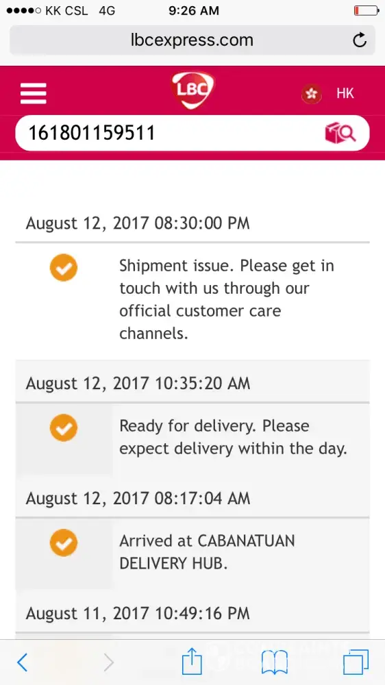 I bought an replacement battery for iphone 5s at Lazada a week ago and earlier I just checked it through LBC's track padala and it says that It has an Shipment issue-thing.