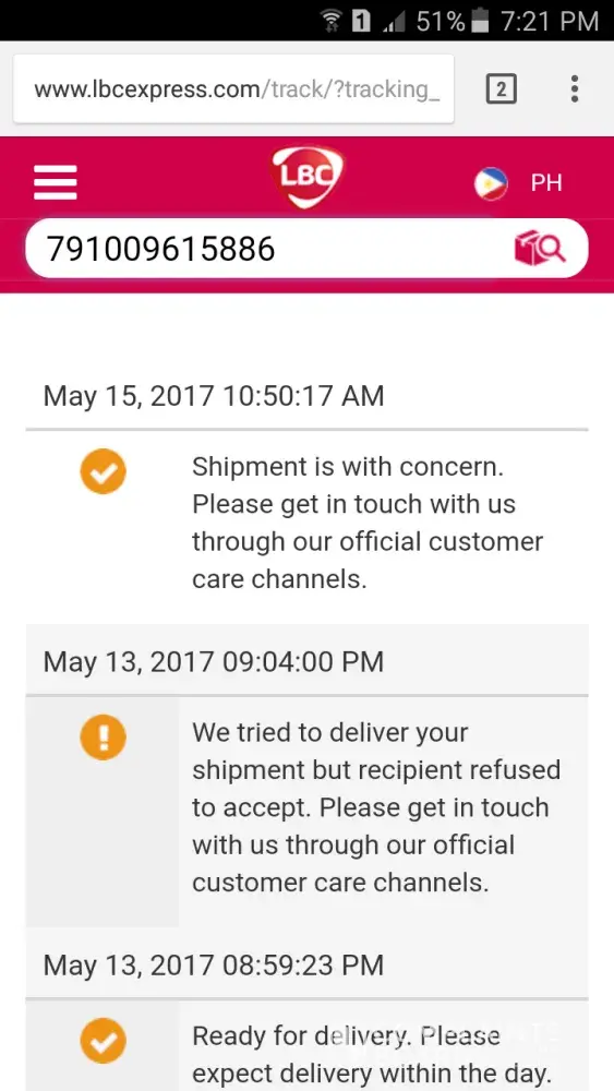 May 08, 2017-monday, out of curiosity i check again the computer and there saw that the box was delivered again for the 2nd time without any call from lbc. I cannot comprehend nor understand why is it so hard to follow my request or is it your policy to do delivery as you will without any consideration to the recipient nor the difficulty of your men in doing their job. If that is the case, then i rest my case.