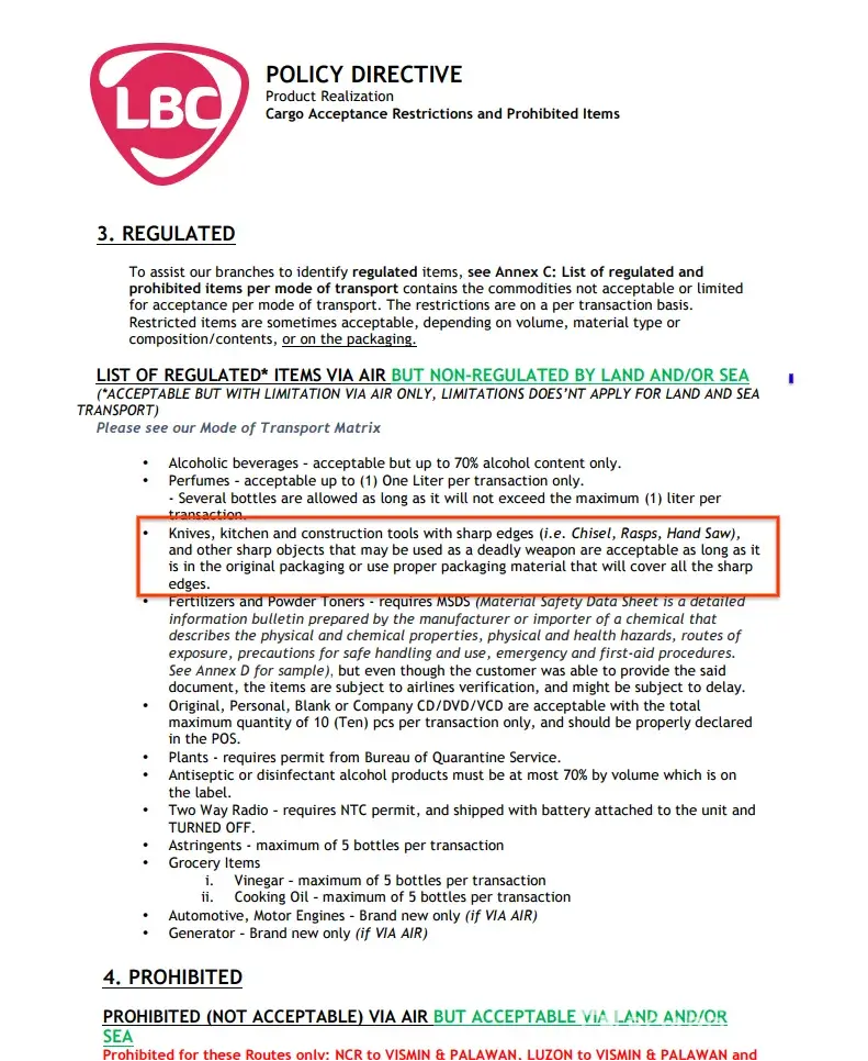 I have read your Policy on your website www.lbcexpress.com and it was stated right there that knives are acceptable under Policy #3 (List of regulated Items via Air. Please see attached copy of your Policy.