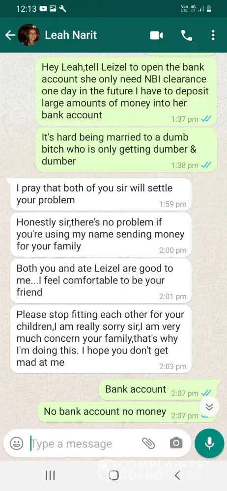 Her name is Leah Narit I send money to Leah for my wife for a few years now Leah is getting all my money I want my wife to open a bank account but Leah insist I keep sending my money to her plus I send to another friend Leah gets the mctn number sign's off & keeps the money that is fraud please help me please Leah is no good Leah is an educated woman taking advantage of my none educated wife