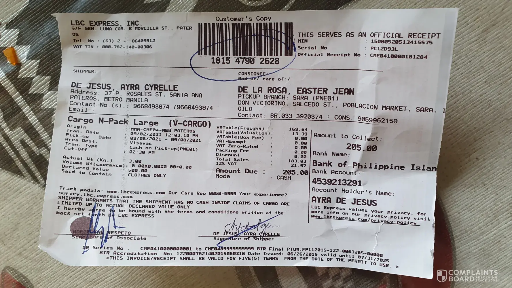 I told her it is for COP .Your staff didn't even bother to ask me regarding the price cost of my items. She just put any amt on the declared products and just put the shipping amt on my receipt. I return also to the said branch and ask help for amendment regarding the price of my items but they said they couldnt amend it anymore as it was alaready encoded on the system.I am an online seller what if the buyer is a scammer and wont pay my items once they received them. I also need money and your staff is so rude you should hire staffs which are more accomodating.