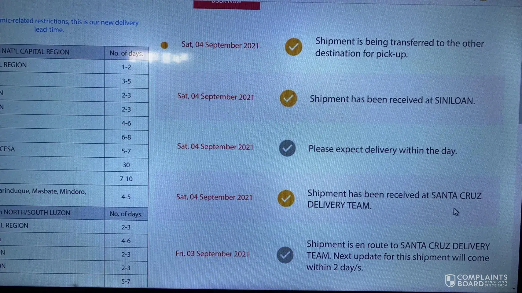 Parcel was picked up on the scheduled date august 31, 2021. Delivery took too long, no updates today is september 10, 2021. Parcel is from cavite to be delivered at laguna only. No updates. No calls. No messages about the parcel.