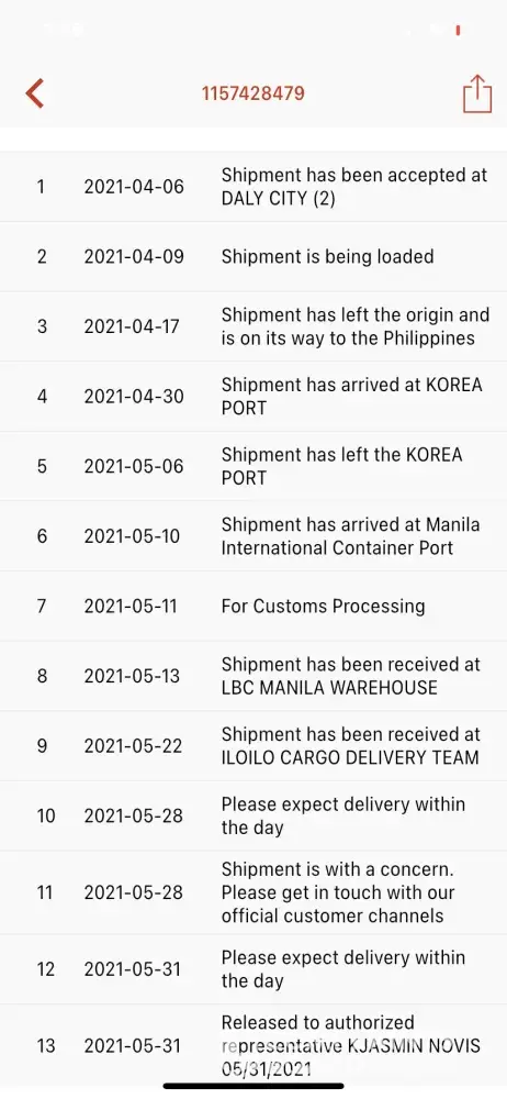 This is Thea Bayona. I have a concern regarding a balikbayan box that was sent by my fiance from Saudi Arabia to the Philippines last March 2020. Since May 5, 2020 it was still for Custom Processing based on your online tracking. He was told before that it can only take 60 days to arrive in Iloilo. But given the situation right now in the Philippines, I know it can take longer than that. He already called your customer service in Manila and even asked update from time to time to one of the nearest lbc branch in our town, but ever since we do not have the exact answers to where the box really is and when we exactly will be able to receive it. We also emailed your customer care center, but they only asked us to track the box on your online application which we are doing since it arrived in Manila, but its very disappointing to see the same status every time.