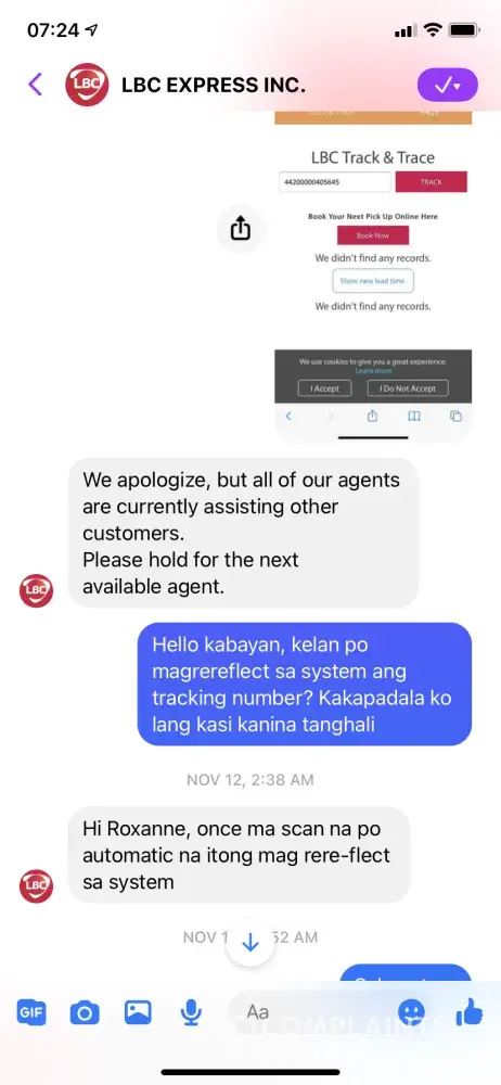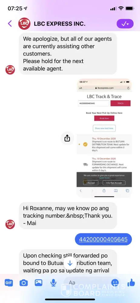 I just want to complain about my undelivered parcel. Dec. 18 I brought it personally to the Greenbelt Makati Lbc branch. The next day when I track it on their tracking website it says that it has been forwarded to the Upper Laguna delivery team so I assume the next day they would deliver it to the receivers address as soon as possible, but to my disappointment they didn't, so I waited for another 3 days until now for an update but there's none it's been 6 days I tried calling their customer care service but I can't contact them. So disappointing 😔
