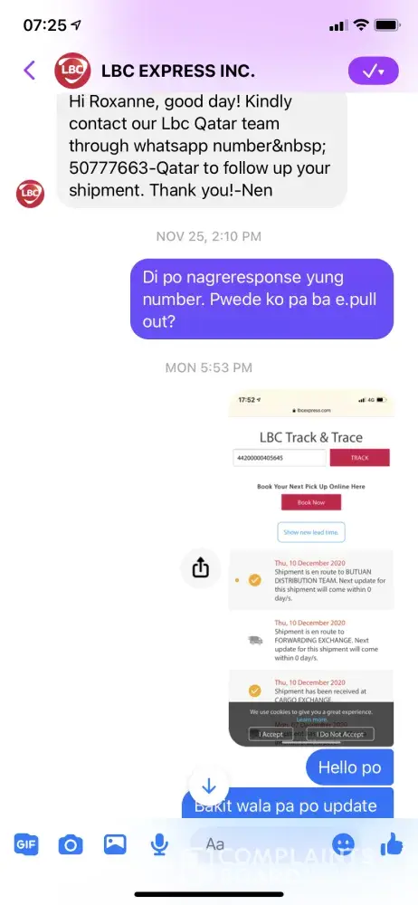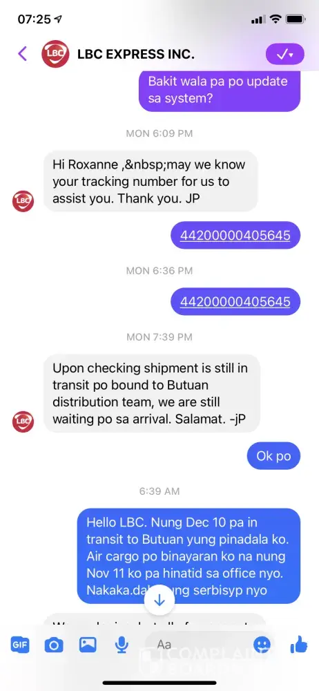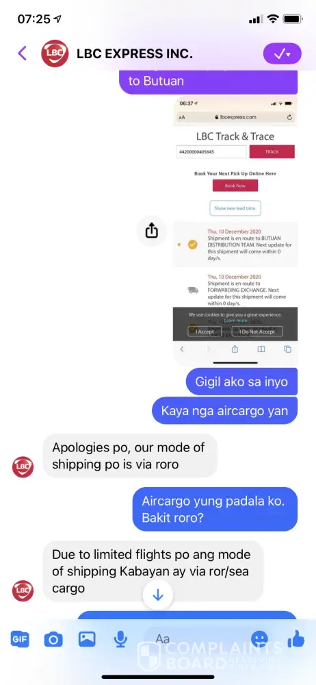 I wanted to express my great disappointment with LBC. November 11, 2020 I personally brought my items to LBC main branch here in Qatar for Aircargo. I was then informed that the next schedule for shipping is on November 14 to Philippines. November 25, I expected that my balik bayan box already arrived in the Philippines but upon tracking my box to my disappointment, the shipment status is showing "Nov 11 shipment is accepted". So then I called every numbers I know that's linked to the branch here in Qatar, I even contacted through the fb account. "Ang tagal nilang makontak" and then to find out that my parcel is indeed still in the branch due to the new customs policy. "Wala man lang pasabi sa akin". Fast forward, finally in the evening that day someone contacted me and then able to submit the requirements on November 26, 2020. Few days later I then received that my shipment will be expected to arrive on December 7, 2020. Today, December 17, 2020 my shipment status is still showing "December 10 en route to Butuan". And to my biggest disappointment, I was informed that they don't still have update yet since my Aircargo box was being shipped via RORO - sea transportation. Didn't I pay for Aircargo for faster shipping? Very disappointed that I have to keep on tracking and asking LBC about my cargo. Very poor service. Worst experience. Very time consuming and very stressful indeed.