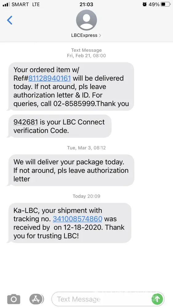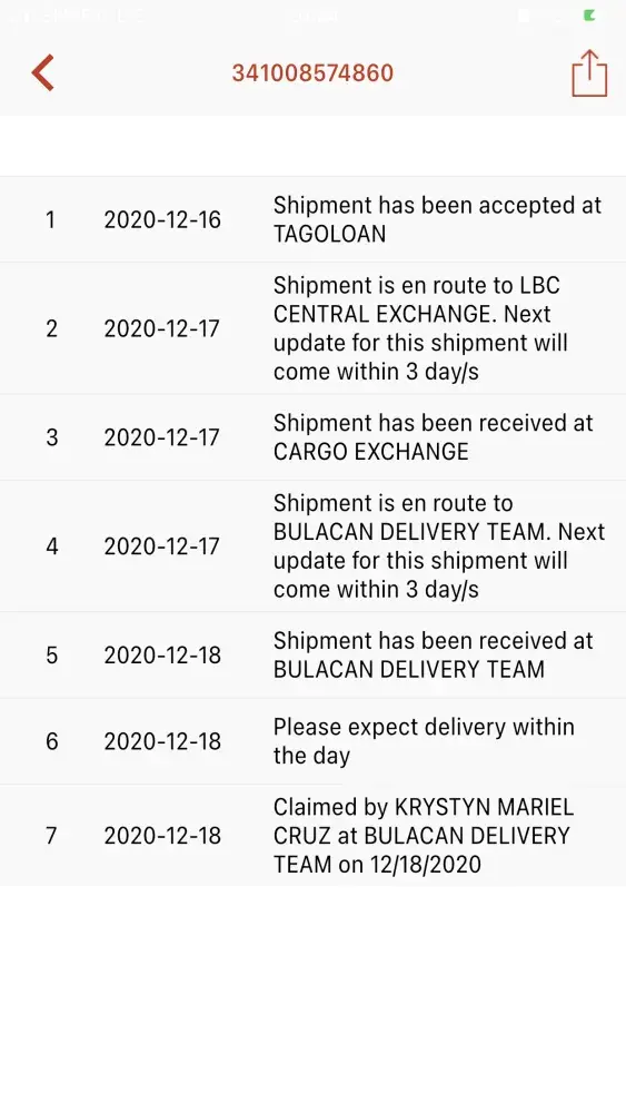 I received text from LBC (today, December 18, 2020) informing me that my package was delivered (on December 18, 2020). I checked my tracking number ([protected]). And it stated that the package was claimed by Krystyn Mariel Cruz (my daughter) on December 18, 2020, but when I call her, she said she didn't claimed any package.