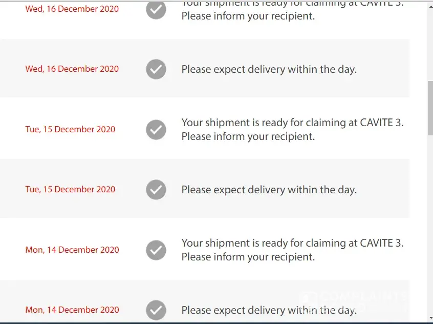 This was sent out on the 9th of December, 2020.. No updates, I was the one who reached out to them since there's no news even though it's beyond the ETA.. When I contacted their CS, I was told that they can't locate my address.. Seriously? I even received my other parcels from different courier services.. There's no SMS nor any calls received as well.. As of this writing, still no help from them.. I even asked if there's an assurance that I will receive the item but they did not give me any answers.. This is really alarming..