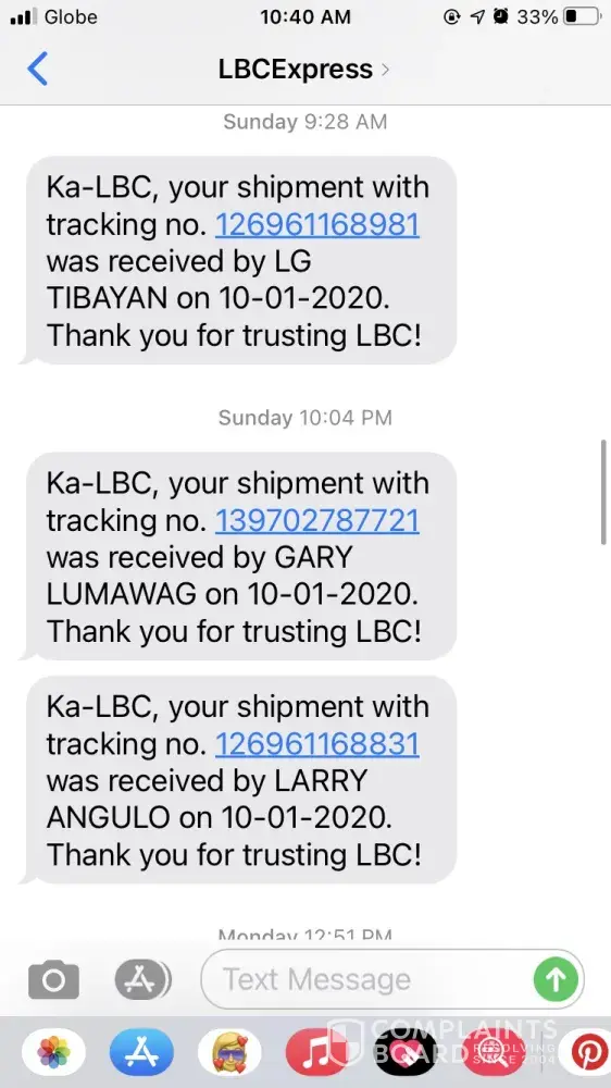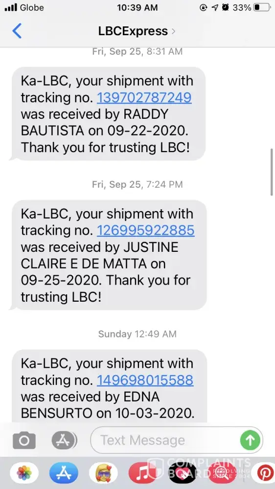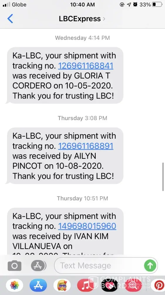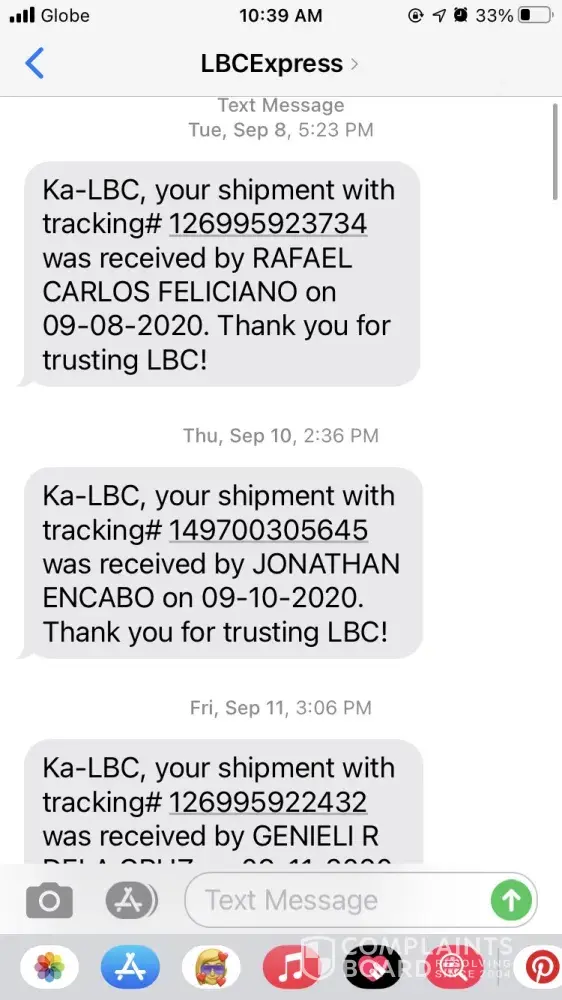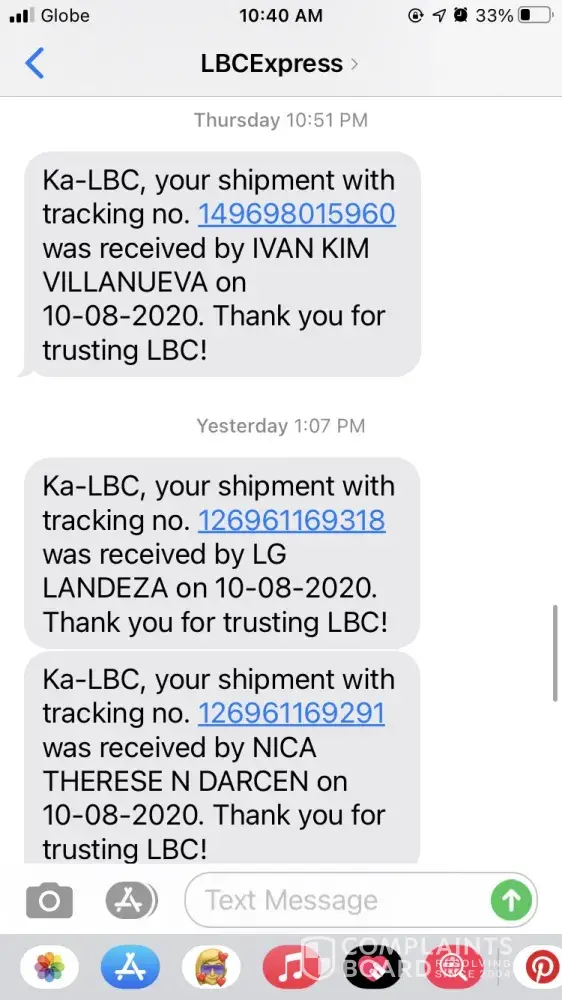 Hi! I have been receiving annoying SMS notifications that says: "Ka-LBC, your shipment with tracking no. xxxxx was received by xxxxx on xx-xx-2020. Thank you for trusting LBC."