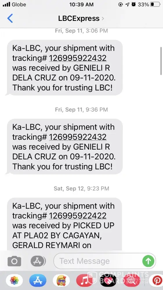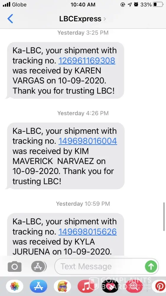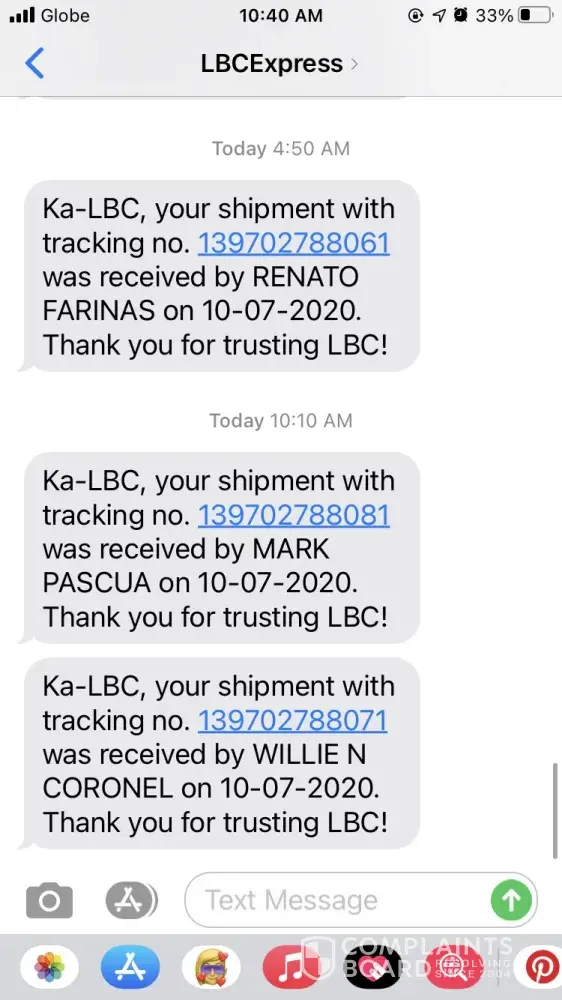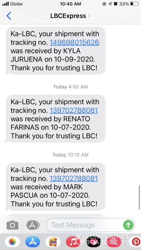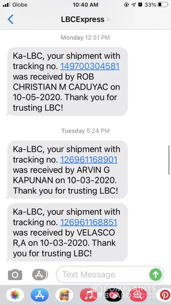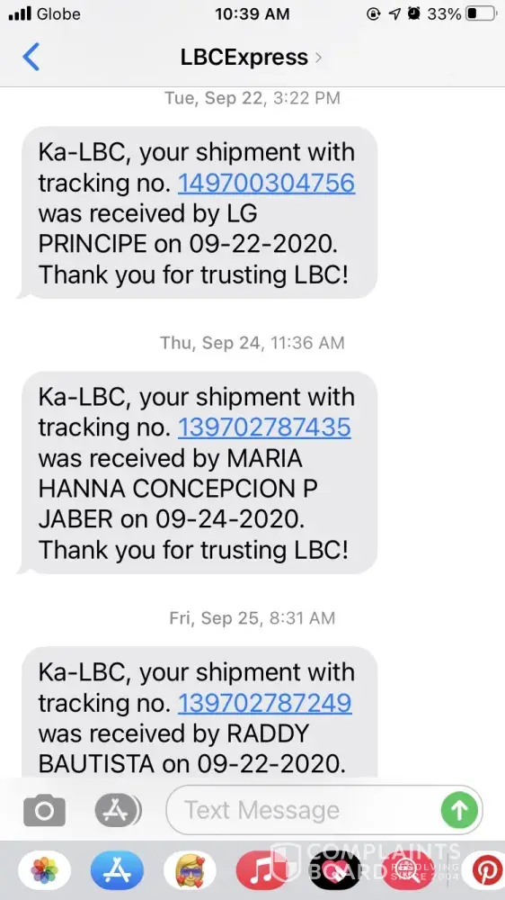 Hi! I have been receiving annoying SMS notifications that says: "Ka-LBC, your shipment with tracking no. xxxxx was received by xxxxx on xx-xx-2020. Thank you for trusting LBC."