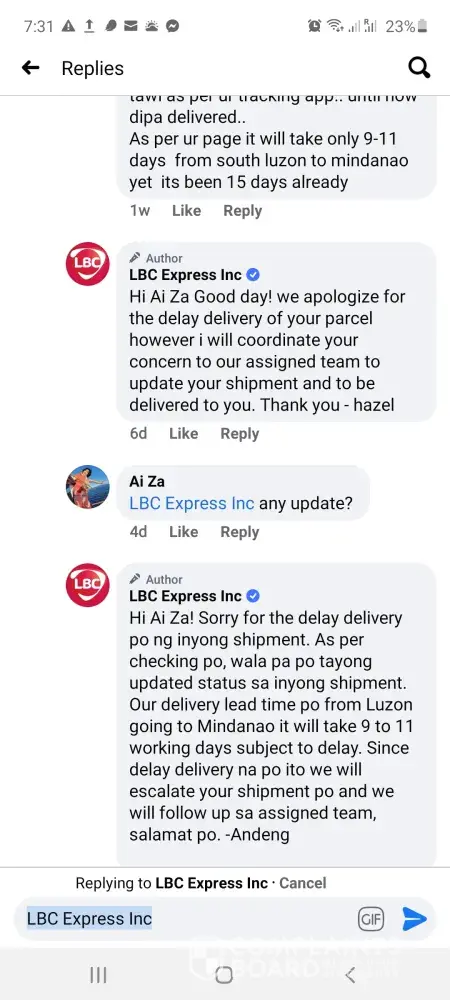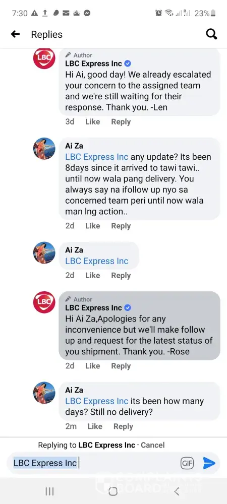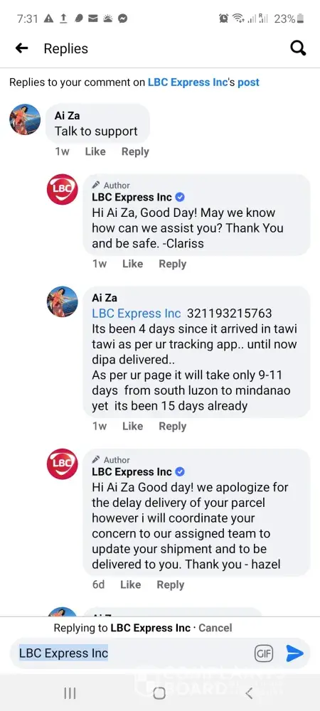 Now I need to go to the branch again to ff up my package and to know where is it right now! That's is why there is lbc delivery to deliver it on time but what happened is it's already 6 days but until now we dont know where is the package!