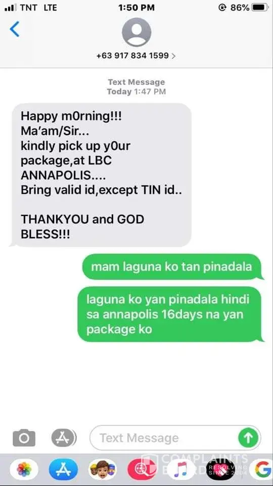 I would like to complain my package sent to lbc annapolis branch last aug.20, 2020 suppose to be going to south luzon particularly sta. Rosa laguna. They told me package will be delivered 6 to 9 days. But after 11 days I follow up with them, still the package is not arriving, worst they cannot track it or went missing. They told me to call me when they find out whats the status of the package but on. The 13 days no calls from lbc I follow with them again they just show me a documents that the. Package was pick up by their courier guy. But the guy is not coming to work yet so they can't question him yet. Until 17 days my relative from laguna sent me a message that lbc annapolis asking her to pick up the package on the same branch where I sent it. I was so shocked and pissed off... At last the. Missing package shows and still it is on the same branch where is send it. What kind of service I am getting here? Im really disappointed by this kind of services...
