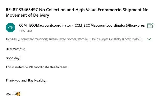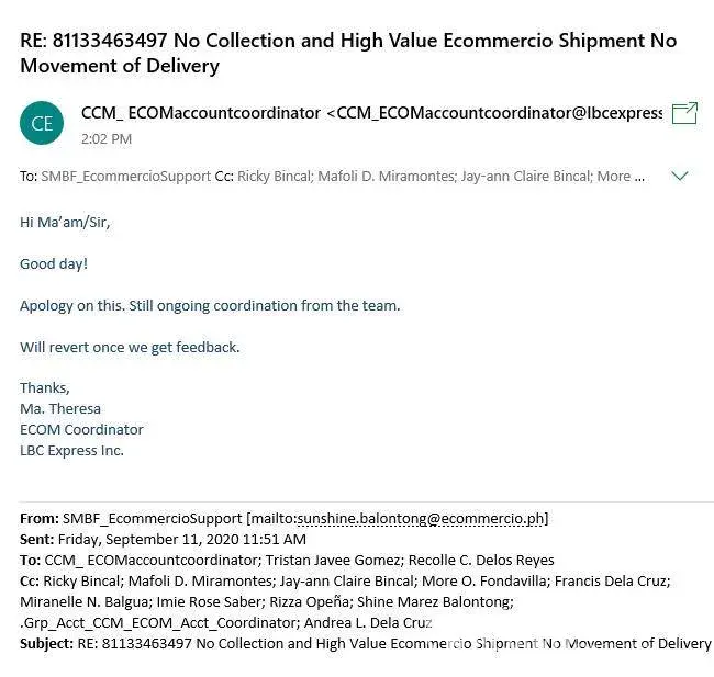 My supplier, Perfume Philippines, delivered my parcel to Exchange-LSC on Sept. 3, 2020. Their commitment is 3-4 days leadtime from NCR to South Luzon, as I'm in Lipa City. Until today, Sept. 12, 2020, my parcel is still in Exchange-LSC. I'm waiting for the delivery of my parcel as it contained the items ordered by my customers, and I'm receiving a lot of negative feedback and complaints due to delay on the shipment of LBC.