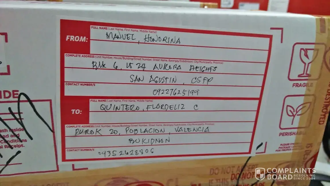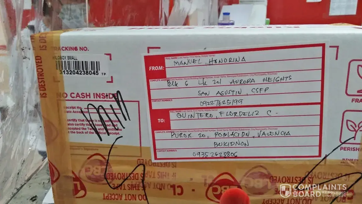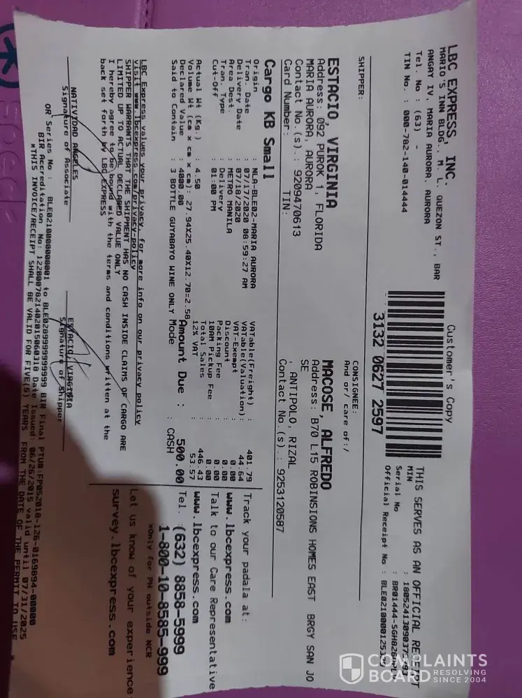 I am making a complaint about a parcel marked as FRAGILE with Transaction Code [protected] declared to be containing 3 bottles of Guyabano wine. It was accepted at LBC Maria Aurora, Aurora on July 17, 2020; arrived at CARGO EXCHANGE on July 18th; and arrived at CAINTA CARGO DELIVERY TEAM on July 19, 2020. However, it was only on July 23, 2020 that the parcel was delivered to ALFREDO MACOSE who was made to sign by the delivery boy who hurriedly left. It was only when the receiver, ALFREDO MACOSE, noticed that the box was torn out and one bottle of the wine was broken. The receiver did not notice it at first because the box was dry and not wet with the broken wine.