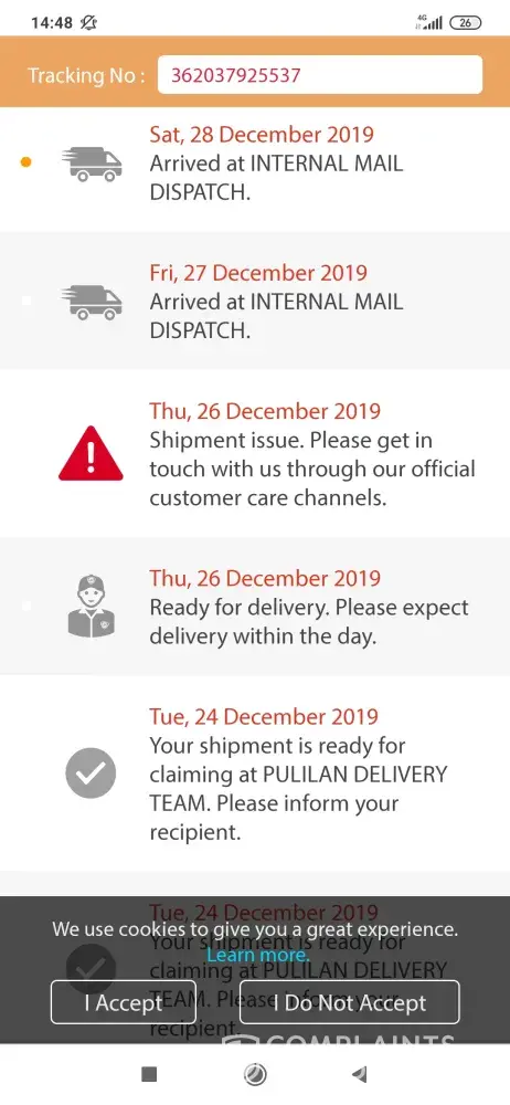Tracking Number: [protected] December 19 - You told at the tracker that I refused to get the ITEM when in fact I didn't saw any LBC personnel at the gate. Even our relatives told me that there's no LBC staff that came here at my address. December 26 - Shipment issues. When in fact I don't know what issues are those. AND YOU LITERALLY SEND IT TO THE...