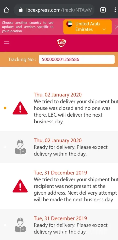 LBC failed to deliver 3x already for reason "no one is home". THIS IS ABSURD. The recipient, who is my wife's father, is at home the entire time since 27, 28, 29, 30, 31 Dec, 1, 2 Jan.