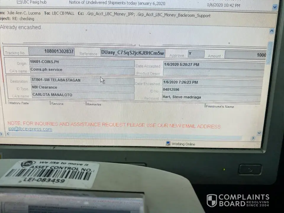 i cash out my money in coins.ph to lbc . when i encash it in lbc on january 06, 2020 5:30pm they said they don't have 10k in their counter, so i decide to get it tomorrow, when i go back in lbc on january 07, 2020. They said that my money was already claimed in sm telabastagan on january 06, 2020 7:26pm. I wrote in form that my claiming address was here in urdaneta city, pangasinan, how come that my money was claimed in sm telabastagan in san fernando, pampanga, please help us po