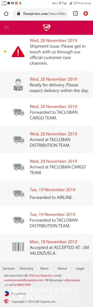 my girlfriend shipped the package last friday November 8 2019 from libertad bacolod lbc branch to eastern samar... before that we ask them what is the nearest lbc branch in eastern samat that accessible to the receiver they told my girlfriend that borongan so we trusted them then we contact the receiver ot the package and she told me its not borongan its guian eastern samar borongan will take 3hrs to travel but in guian its only 1 hour so we told the lbc bacolod libertad branch on that matter they told my girlfriend that they emailed the borongan to transfer the package to guian upon arrival but until now the package in is still on the lbc that we dont know what happened to the package my girlfriend go to the lbc libertad branch and they tols my girlfriend to wait another week this not ok for me that package is our business and the our costumer wich is the receiver is already complaining plsss i to much trusted lbc for shipping my products but this is not acceptable for me its already a week and then they will say to my girlfriend to wait another week? come on plsss make some action to this thank you