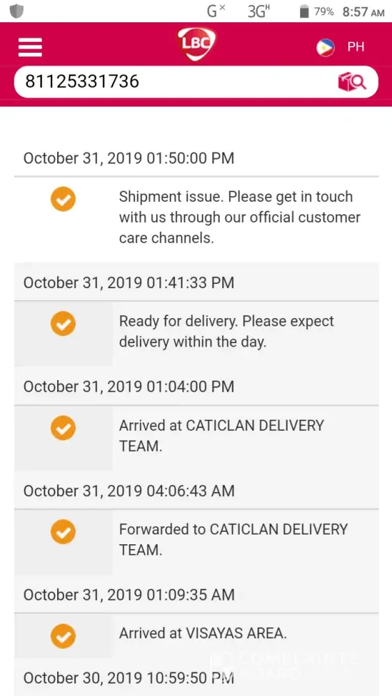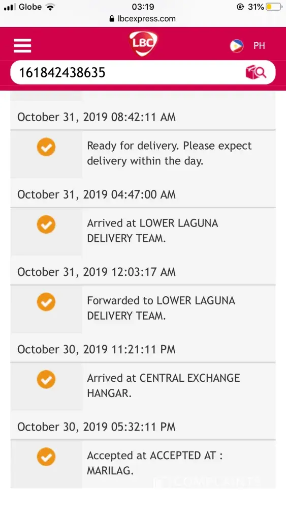 As per your LBC Track and Trace, at 05:16AM of October 24, the package arrived in Muntinlupa. My client and I were monitoring when it will be available for pick up within the day as it says in your transaction slip that Pick-up Date is October 24. At 08:57AM, it said in your tracker: "Ready for delivery: Please expect delivery within the day."
