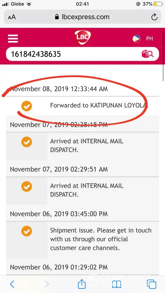 Nov 8 - i check the status of tracking and it says its at katipunan (senders branch)