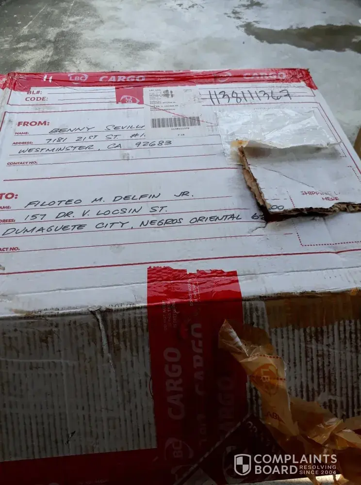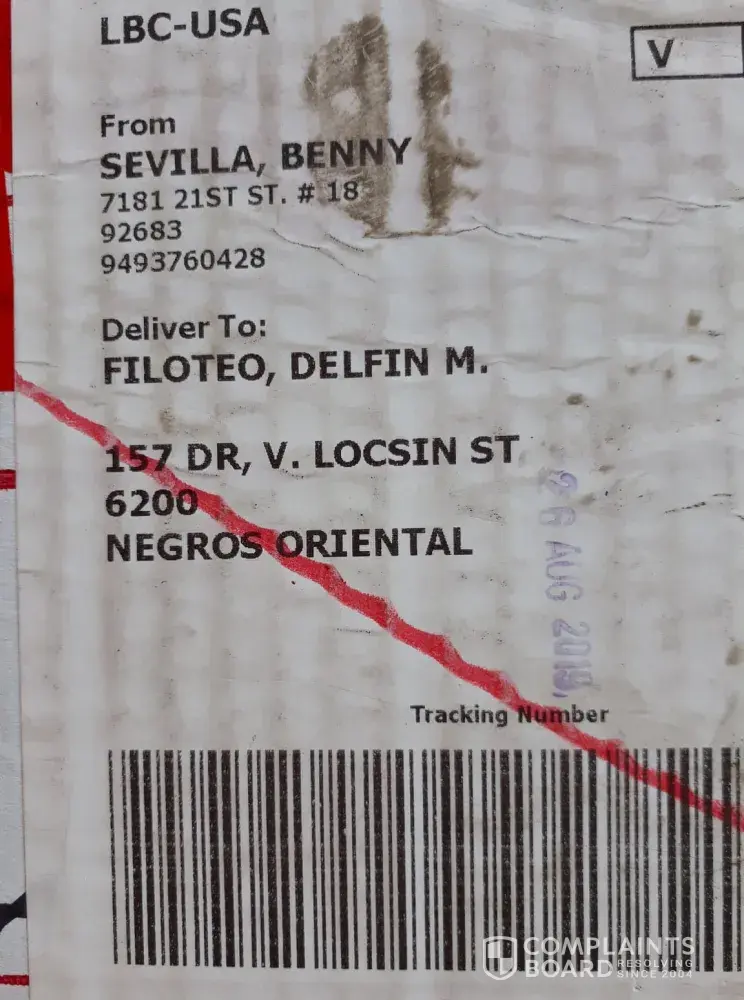 Packages with tracking no. [protected] was received by me, Filoteo M. Delfin, Jr. from LBC philippines with tear or ripped off from the side of the package with lots of items missing or stolen. This package was sen to us by Benny Sevilla of 7181 21st #18 wesminister, CA 92683. its hard to trust LBC after this.