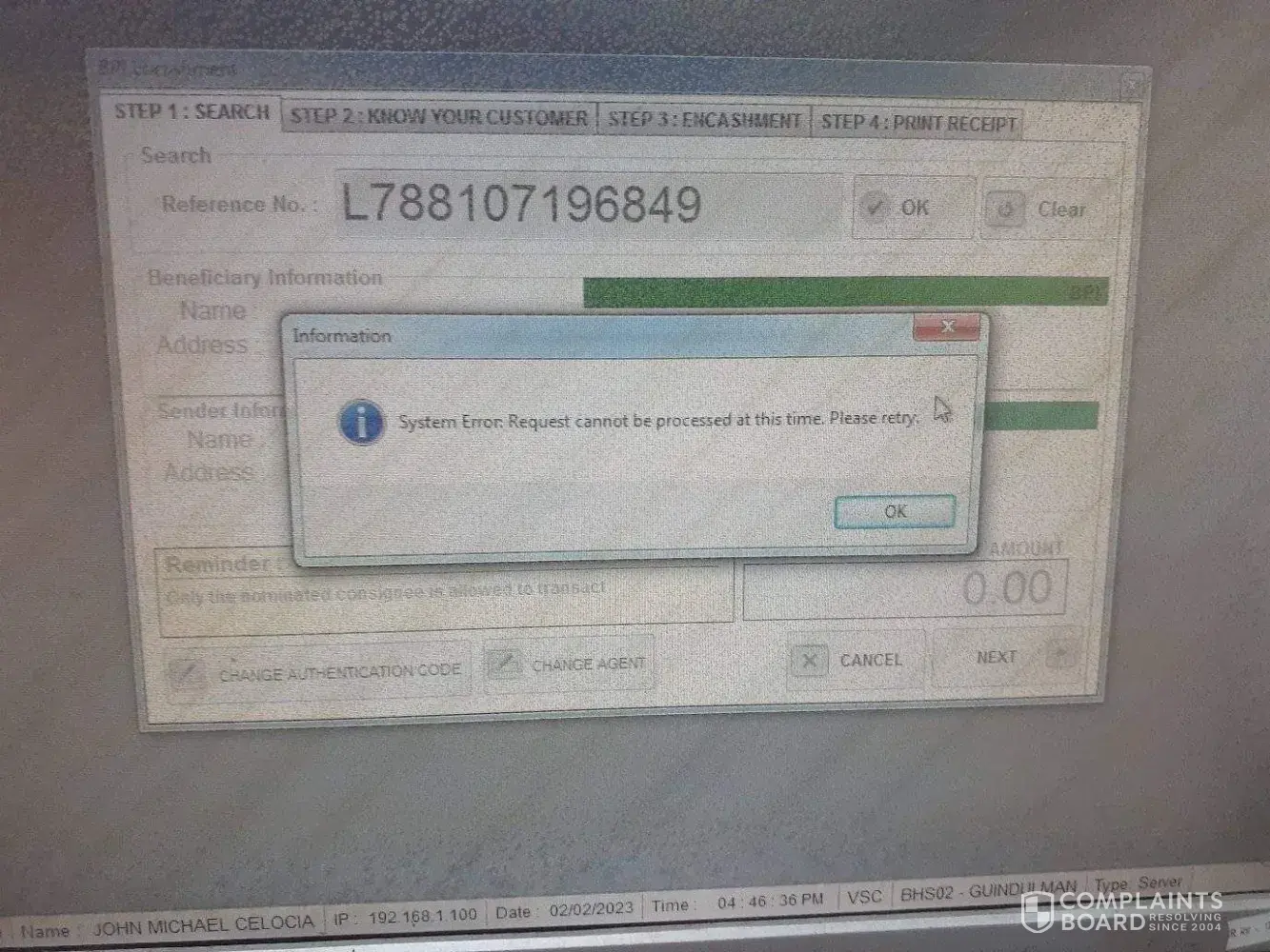 It happened on Feb 1 and 2 when BPI to Cash recipient cannot withdraw money due to system error (according to the branch -Guindulman Bohol). Time wasted, money wasted for nothing. This is the second time that happened. Advised recipient to go to another branch and hopefully get the money. Hope LBC will get their act together and improved service. Will personally visit the branch next month to check if any action has been taken to improved service.