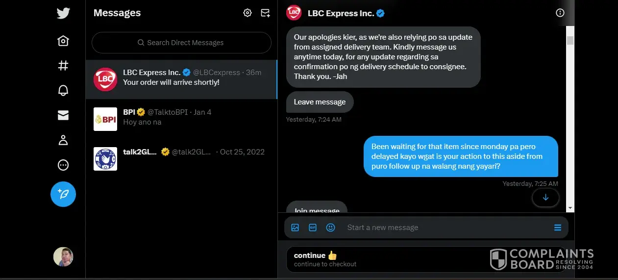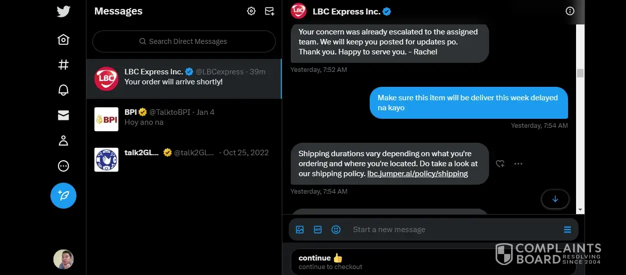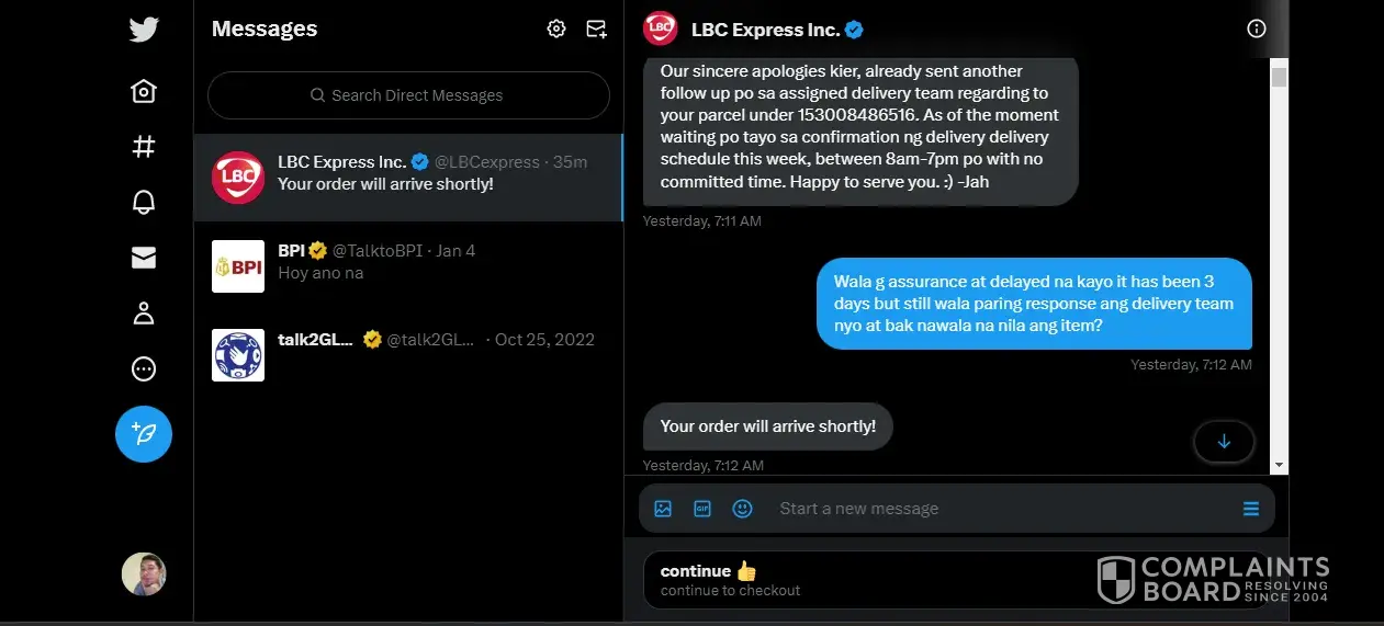 My complain is Yung bdo credit card ko dumating na pala Wala man lang text or any update from LBC then sa tracker and sa customer service nila nagpapasapasahan lng cla Kung sino lalapitan Kung Hindi pa ako pumunta sa bdo ndi ko pa naayos Yung problema.