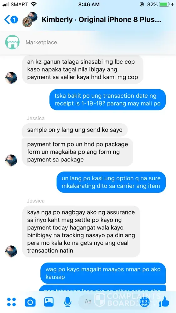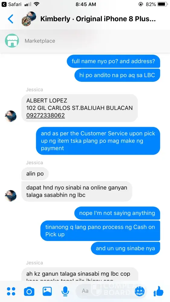 June 18, 2019, I made a transaction through LBC (pera padala). It's suppose to be a payment for an Iphone 8 plus buy the seller/scammer who's name is "Jessica V. Lopez" but using "Albert Lopez" as the recipient of the payment. We both agree that day to send a picture of the receipt as a proof. I shade the part of my tracking number so he/she can't use it to encash the money. The day after we transact I didn't receive any updates nor I can call the phone number he/she provided [protected]). Then, Thursday June 20, I went to the store where I remit the money and found out that it was already encashed.