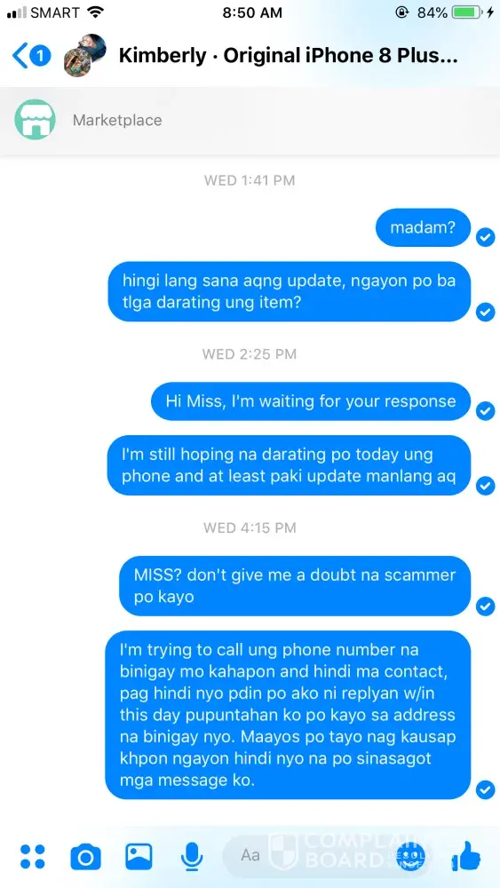 Up to now June 22 of 2019, I didn't receive any item at all. Also, i found out that the FB account this scammer is using was hacked. So, the picture that is showing in our conversation is not who he/she really is.