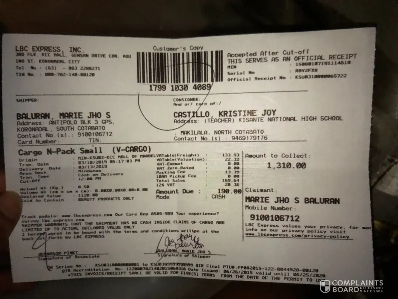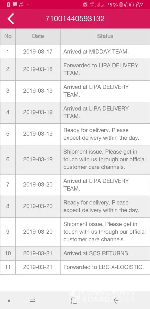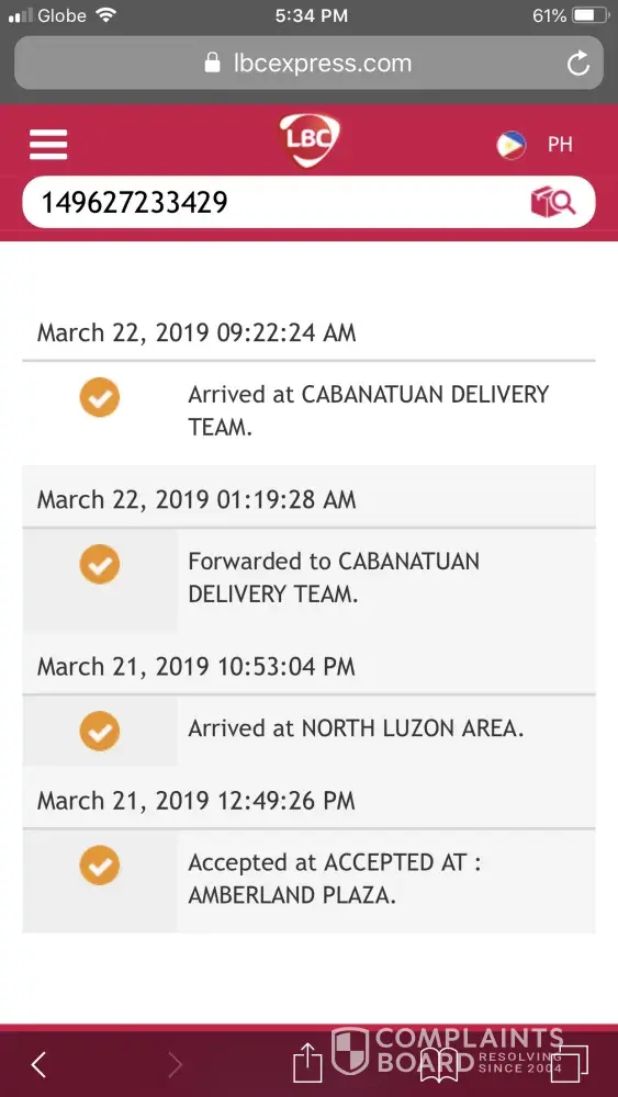 March 14 nagpadala kami sabi sa tracking ng lbc nasa laguna delivery team na nung March 16. Hanggang ngayon d pa narerecieve ng customer namin. Sabi sa report no payment. Nagrereklamo customer namin na bakit no payment eh hnd naman talaga dineliver sa knila kaya d pa nila nababayaran. Araw araw nila inaabangan delivery hanggang ngayon wala pa. Dog leash lng naman na tatlong piraso bakit hirap kayong ideliver.