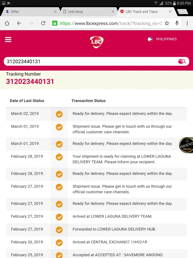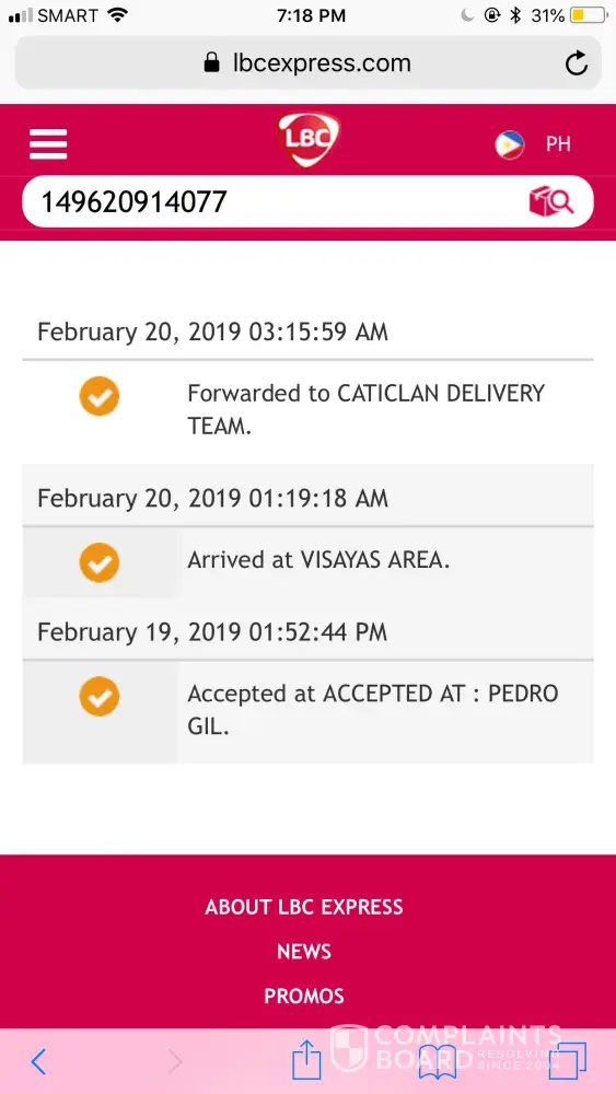 Good day, ive sent my cargo last february 22, 2019, expected delivery must be feb 22, 2019 according to their receipt provided w/ tracking#: [protected], the cargo arrived in tagbilaran delivery hub february 25, 2019, see how fast they are. They been out of their limit the items should be delivered. As of today the status is, "ready for delivery. Please expect delivery within the day". Today, february 28, 2019, the receiver didnt receive any items from lbc.