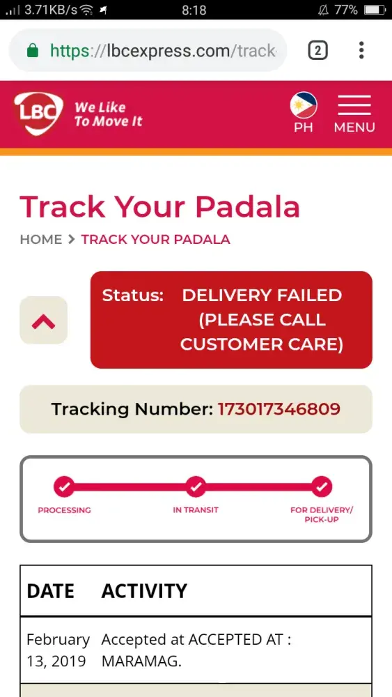 Tracking # [protected], After several follow ups, walang nangyayari, di ngmomove yung items, wala din update.. Feb 16 pa shinipped saken yung item, until now wala pa ko narereceive, hindi namen alam kung nasan na yung item.. Yung mga staff ng lbc please pakibgyan pansin ang reklamo namen, Kasi order yun and paid na ng customer namen.. And paid na din namen ang service nyo.. Kaya please pakiayos.. & magupdate po kayo ng tama.