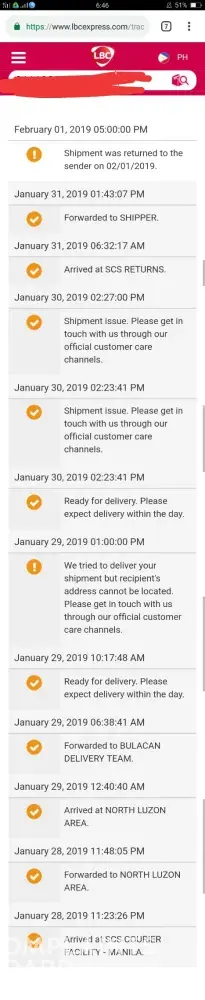 I don't know whats the problem yet the item i shipped back to zalora last january 31, 2019 was recieved by shipper last Feb. 6, 19.its an complaint that needs further action since LBC customer service is not responding.