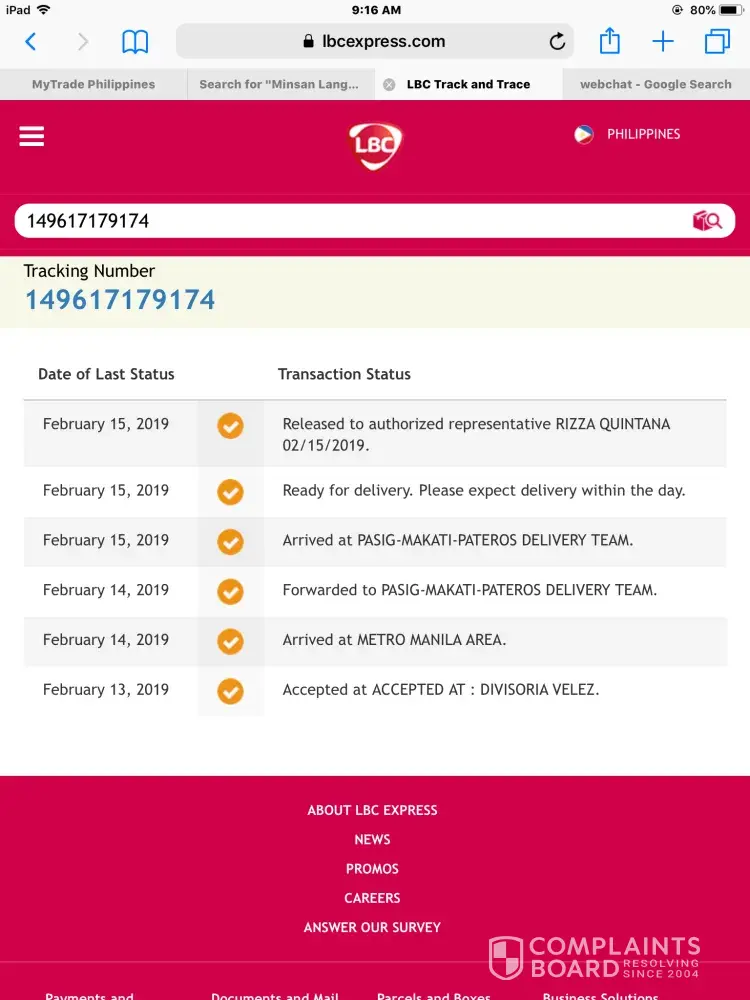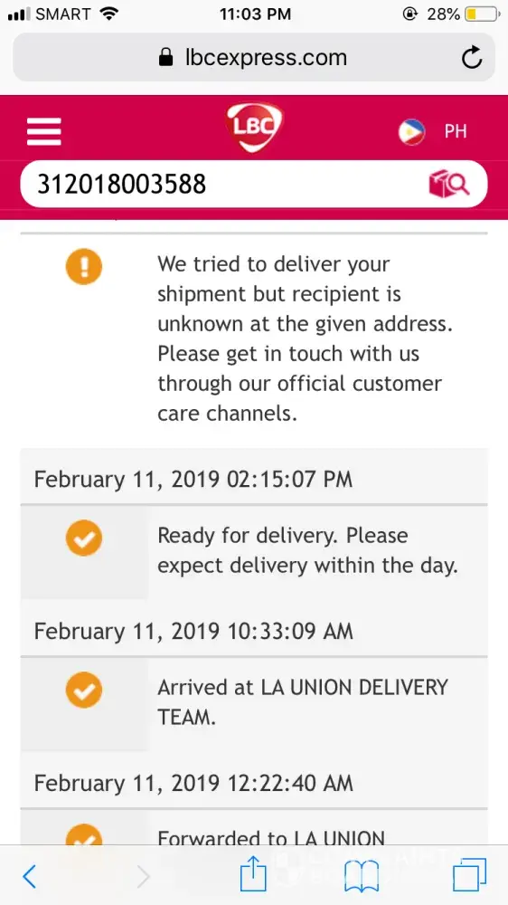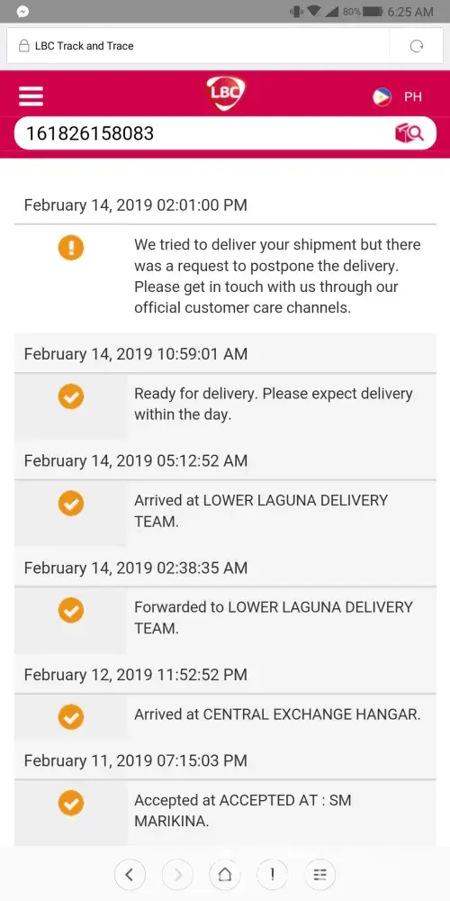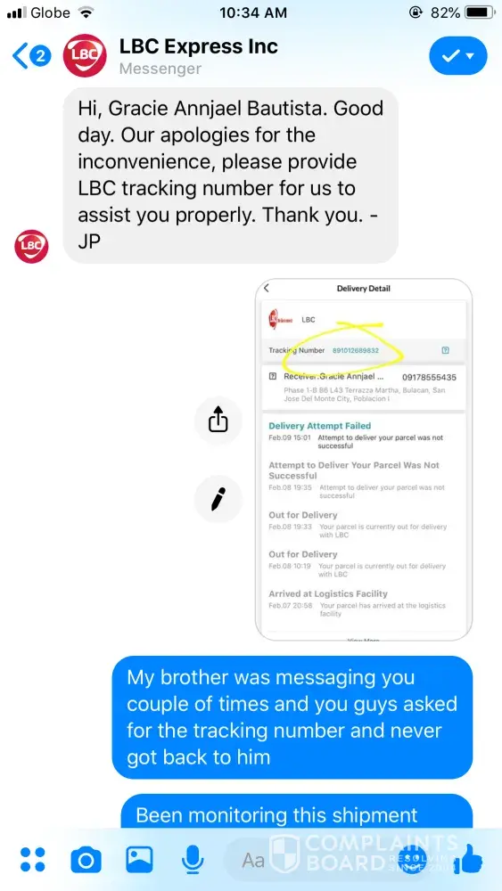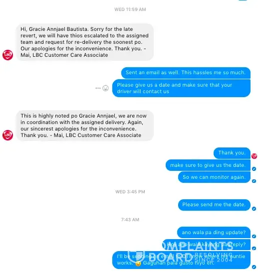 We asked our village guards if there's someone from lbc looking for us and even asked the next riders if we have a package and none said we have. Now, I tried calling your hotline since feb. 10 and until no one answers my call after making me wait. I messaged your facebook and the attached was our conversation. As expected, I got nothing but wasted time!