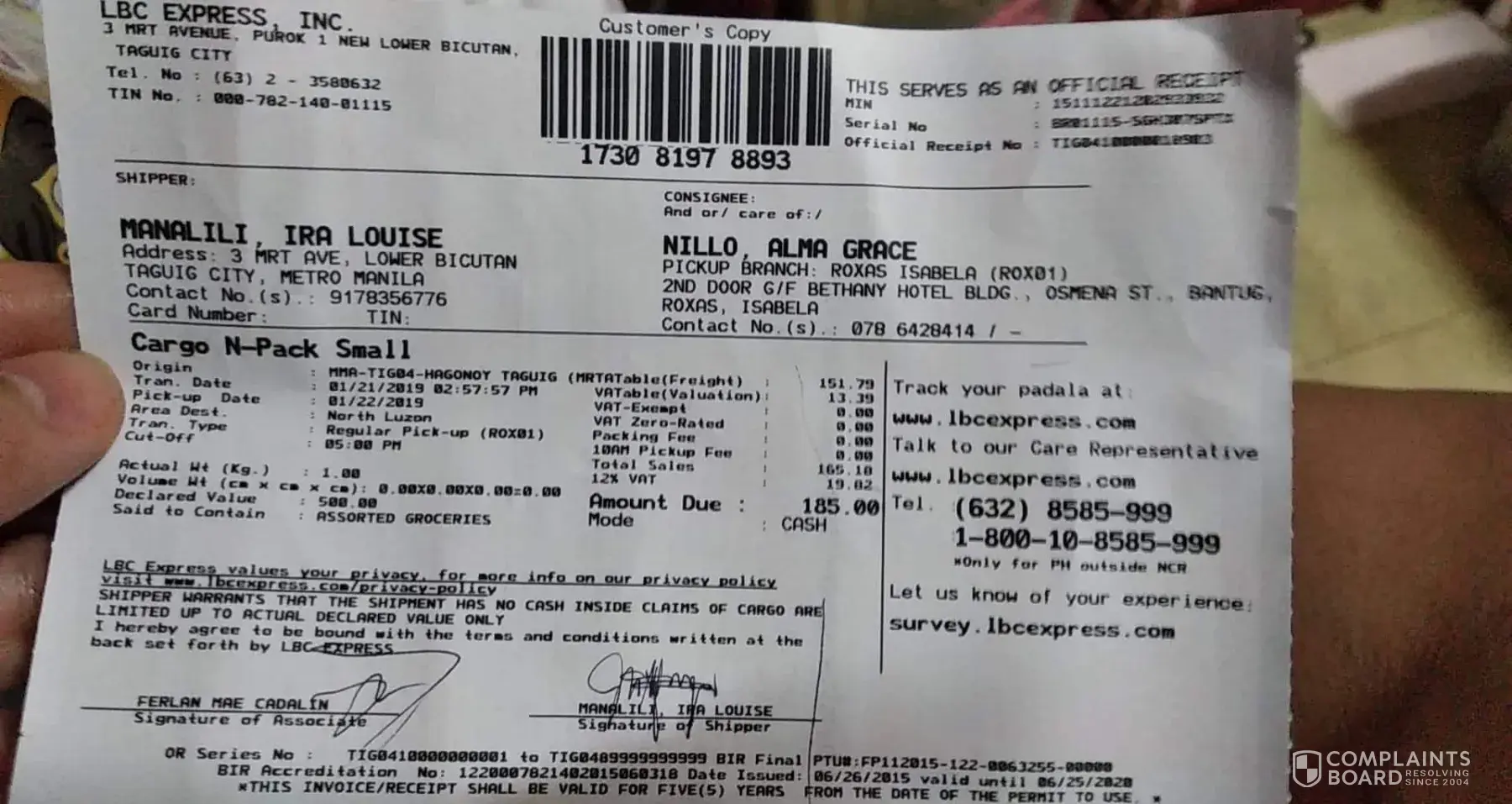 January 15, 2019 in the afternoon my mother went to LBC express Vasra, Culiat branch to send a document. She filled all the necessary forms with the correct name of the receiver (Lourdes B. Dela Cruz) and paid the amount and so she got the receipt with the details of transaction and tracking number of the document.