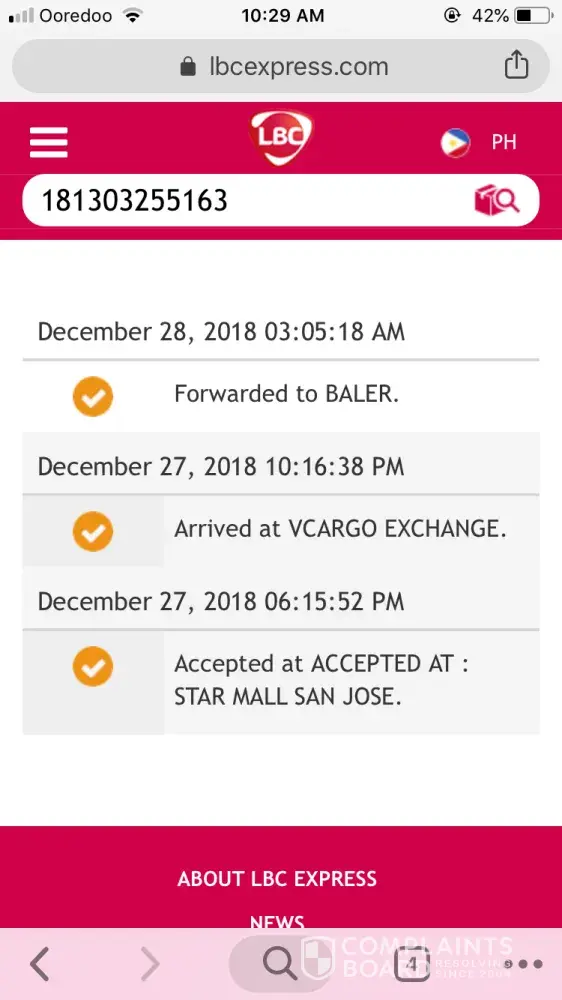 My husband last dec 27, 2018 and we have been tracking thr said items and twice my husband did even visit baler lbc to inquire regarding the sent items but until now it's showing forwarded to baler, and the employee in lbc baler said that he did e mailed the lost items (pertaining to our tracking no) my husband have talked to the manager of lbc cabanatuan and said that my husband has no right to complain as he is not the sender, I mean, what? Really, that's too ironic, my husband is the recipient supposused to be right? And my friend after few days will be coming back to mid east for werk, if my friend can't do it then it's done, what's not delivered or lost is lost? Up to this date I did tracked it again and its still forwarded to deliver! I'm pretty sure u don't want to ruin your ne lbc, I have been a customer and this saddened me. Hope your company can be able to do something of my complain. Thank you!