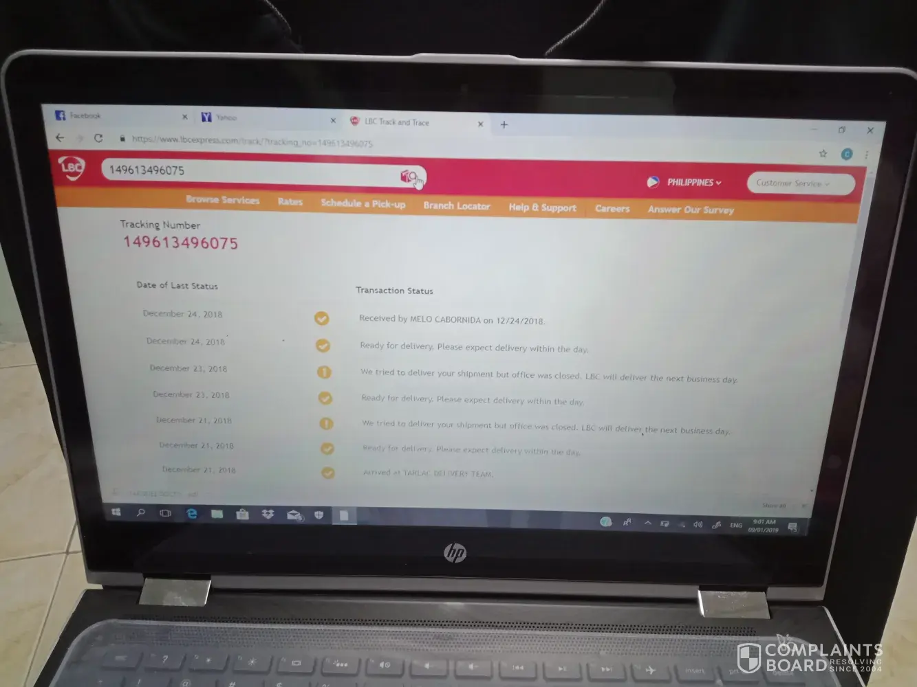 10. around 9 am, january 9, 2018, I called up lbc customer service hotline 02-858-5999, via long distance call. an lbc representative by the name of lea told me to ignore the december 24 entry in on line tracking because the package is still in lbc maliwalo branch in tarlac city. I informed lea of lbc that I demand an explanation for the mess that caused severe moral damage on my person because I was made to appear to be a liar. lea told me that she has made a report already and I hanged up.