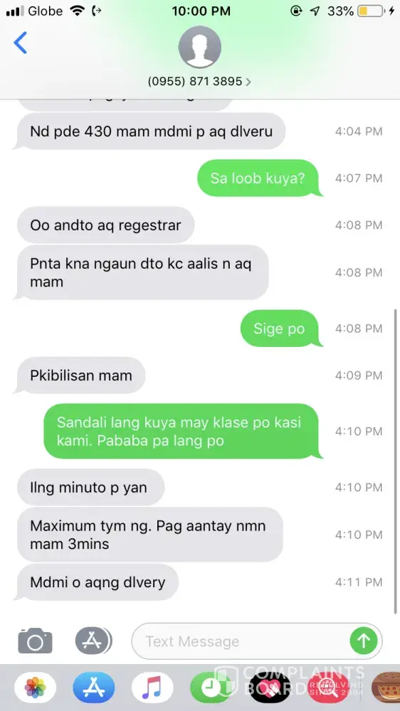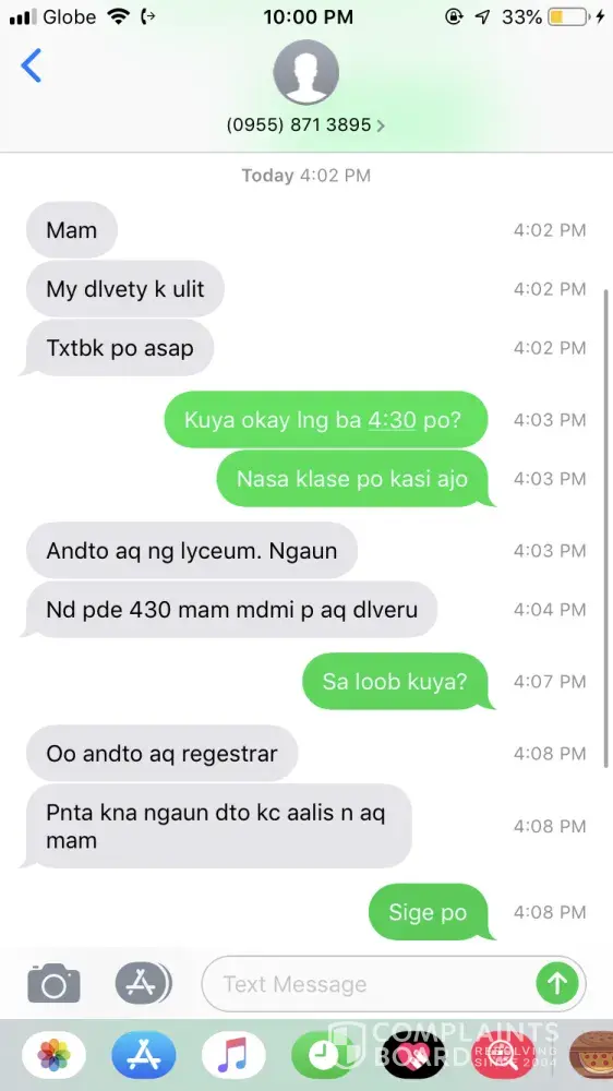 Hi! I just want to report this incident because for me it was so rude. I've been ordering online countless times and I've been also receiving my orders from different couriers such as: Ninjavan, JRS, BlackArrow, and LBC Express (also from different branches: Cabanatuan City, Baguio City and most recently, here in Dagupan). The rider texted me that he'll be delivering my order yesterday and of course I was expecting that he will deliver it to my address I placed on my order which is in my exact room number and floor (third floor of an apartment) and he was calling saying "Mam bumaba na lang po kayo madami pa po kasi akong idedeliver". Wala pang isang minuto, tumatawag sya ulit then, pagalit na tono nya sabi pakibilisan daw at nagmamadali sya. I let it pass kasi baka kako pagod na si kuya (4:30pm na kasi non). Pero nagulat ako ksi I've tried Ninjavan, and the rider was so polite and he even went upstairs para sa order ko. Samantalang si Kuyang LBC, ako pa magaadjust na bumaba at bilisan kasi nagmamadali sya. Then kanina, may delivery ulit ako. Nasa school ako so i replied to him (you can see the conversation below). And ang rude lang ng way nya. Tapos magbabayad na ko. 357 pesos ung order ko then im lending him 400 muna kasi kumukuha pa ko ng 7 pesos para 50 na lang isukli nya sakin kasi wala akong exact na 357 pesos. Nung kumukuha pa lang ako ng barya nagkamot na sya ng ulo sabi "Mam barya na lang" na parang iritado sya. Kumakalma na lng ako kasi kahapon pa sya ganon. Nakakabastos na kasi talaga siya seryoso. Kung di sya masaya sa trabaho nya, wag niyang idamay customers nya. I hope LBC would do something about this. Talk to your riders or your employees to treat customers with respect. We are all busy. Di lang siya, di lang ako. Good communication and a little of politeness will do.