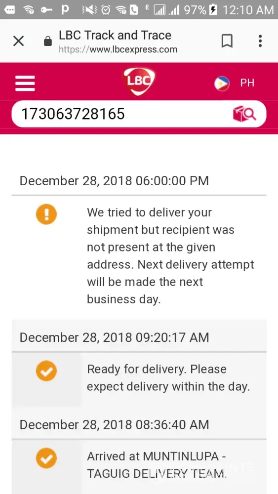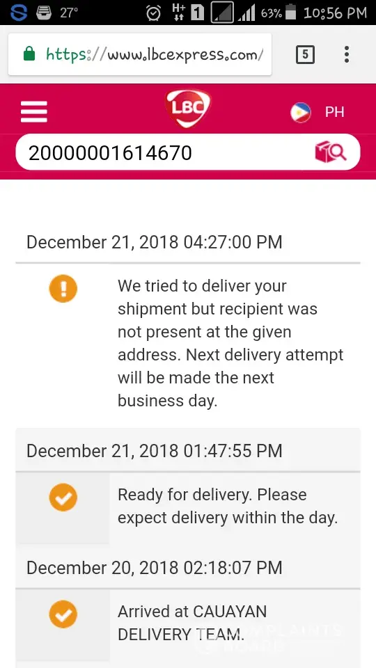 I ordered a lazada product last december 12, 2018 & supposed to be shipped today Dec 21 as I trace the tracking record. But record says that the recipient is not present at the time of delivery. Usually they will call me before the delivery pr kung my my problem sa address given. This time i did not receive any calls from lbc. My point is don't write any report sana na hindi naman tama just to say na nag-attempt silang ideliver yung product. We understand na maraming deliveries & we're willing to wait. Pero ung mga reports sa mga tracking nyo mukhang hindi nmn makatotohanan. referring to LBC cauayan hub. I hope you can do some action regarding this matter. Thank you.