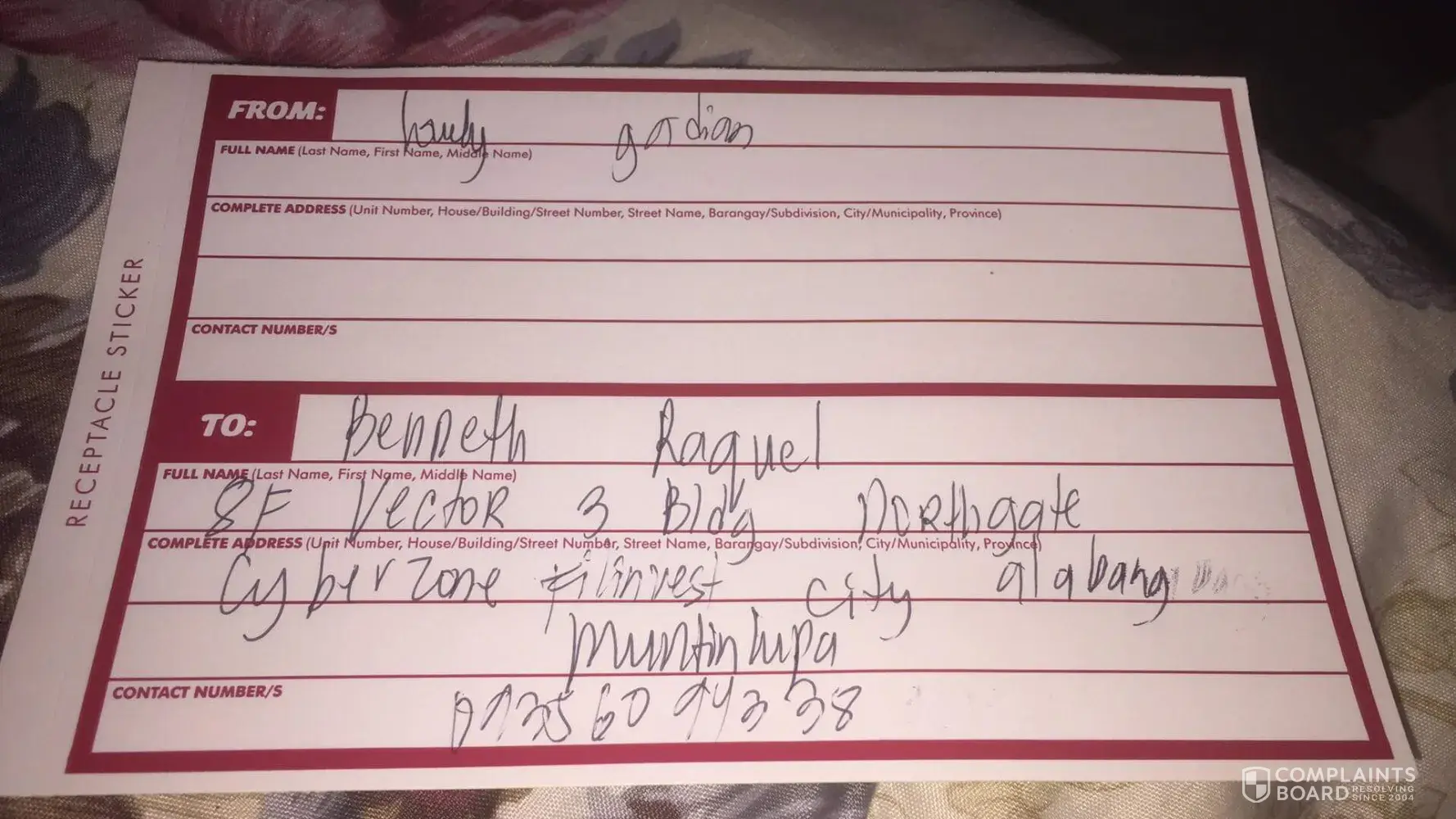 I would like to file a formal complaint to LBC San Fernando La Union for believing the receiver's neighbor that the receiver of the package does not live there anymore (change address) and not trying to send it back again and just decided to send back the package to the place where i sent the package (LBC harbor Point Subic)
