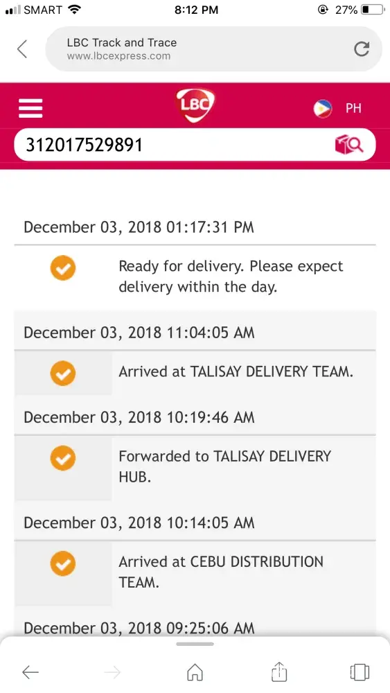 just wish that this issue of late delivery of packages will be addressed. Before, I really admired the fast or next-day delivery by LBC provided the packaged is accepted within cut-off time. But lately, I already experienced receiving late deliveries several times. Like in the attached example, tracking says it was supposed to delivered yesterday but I have not received it yet.