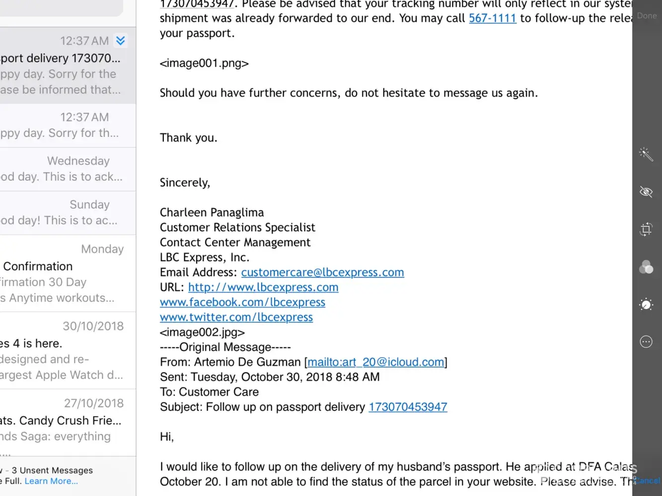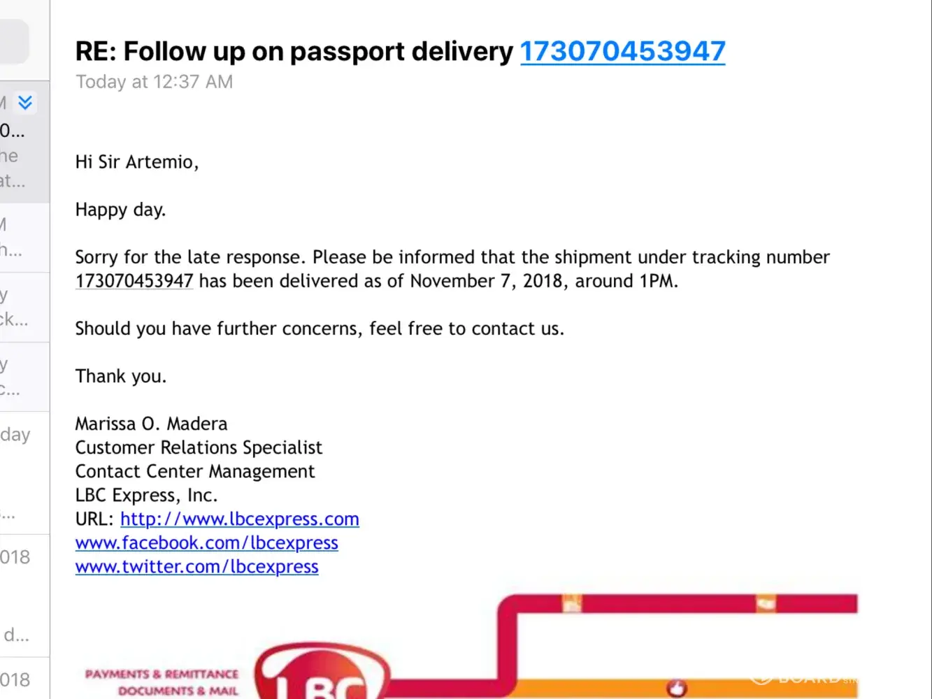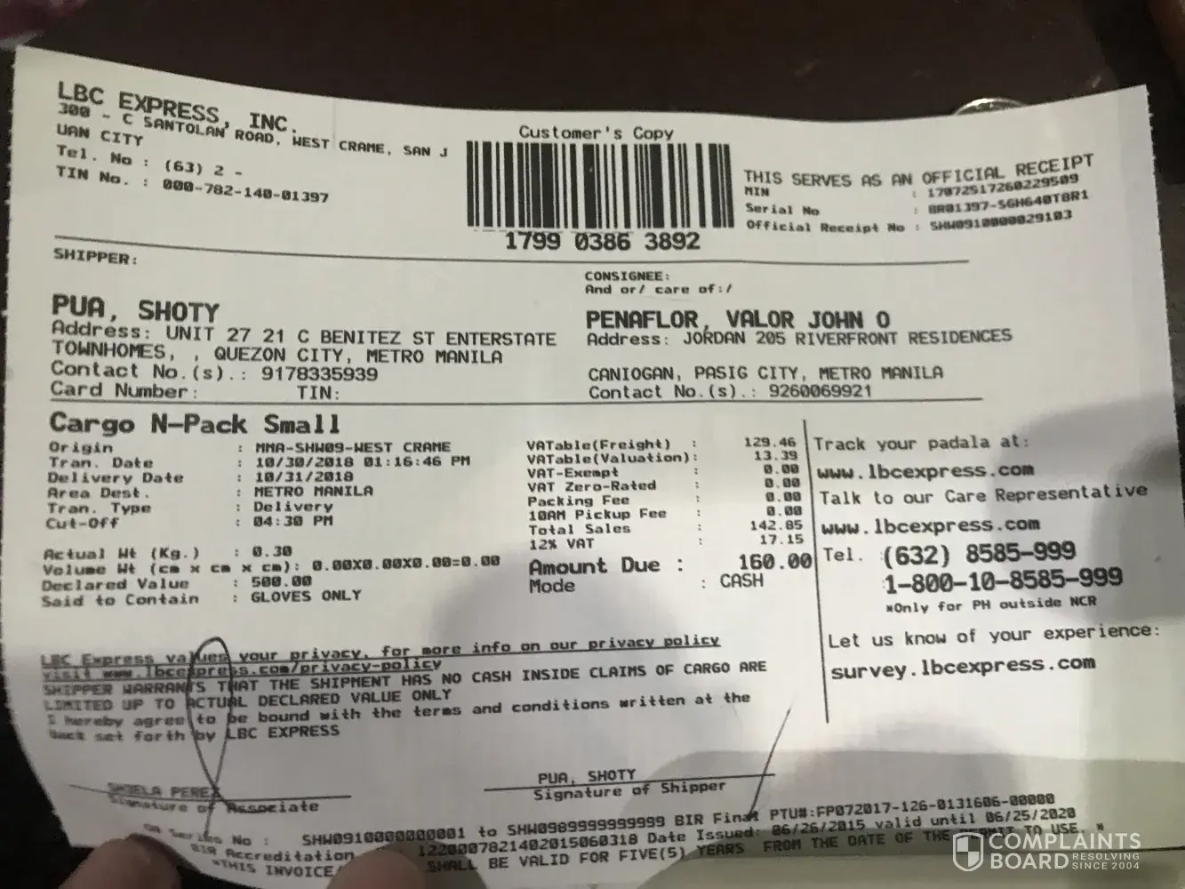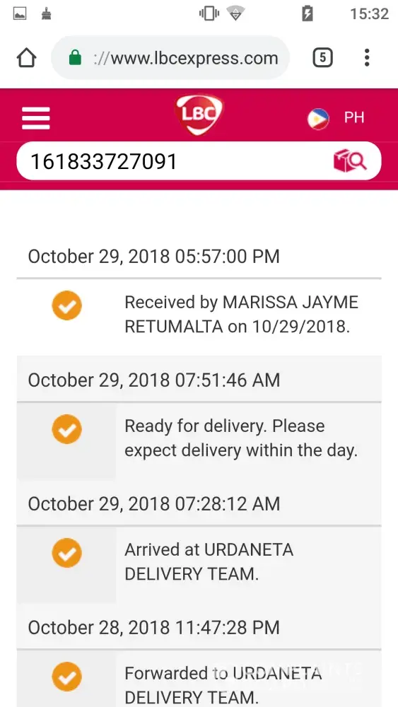 Receipt no. is [protected]. It was a birthday gift to my son's birthday (Nov. 01). Received a sms confirmation from LBC that my package was received by my wife last Oct. 29, good to hear that. But when I called my wife yesterday (Nov. 02), she said that they didn't received yet the package.