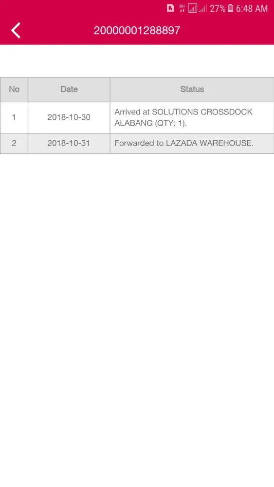 October 25, 2018 Arrived at LAZADA CABUYAO (QTY: 1).