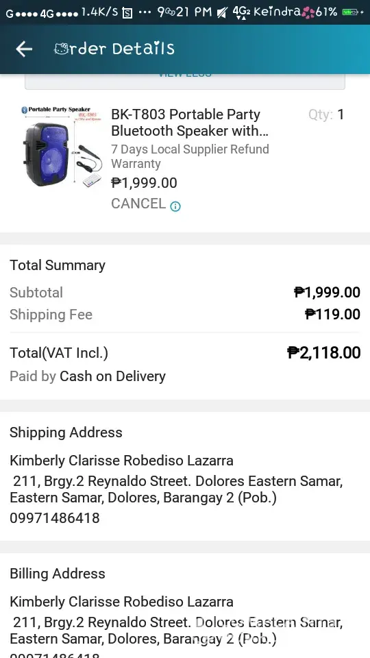 Good Day. Nagorder po ako sa Lazada ng portable speaker cash on delivery. Nagaantay po ako kung kailan dadating. tpos nung trinatrack ko na ung item ito na ung lumalabas. Nag.order dn nman kmi last time COD. dumating nman pero bakit po ganito ung ngaun? pki.ayos nman po salamat .. KIMBERLY CLARISSE ROBEDISO LAZARRA 233, BRGY 2, REYNALDO STREET DOLORES EASTERN SAMAR. Need your reply. thanks!