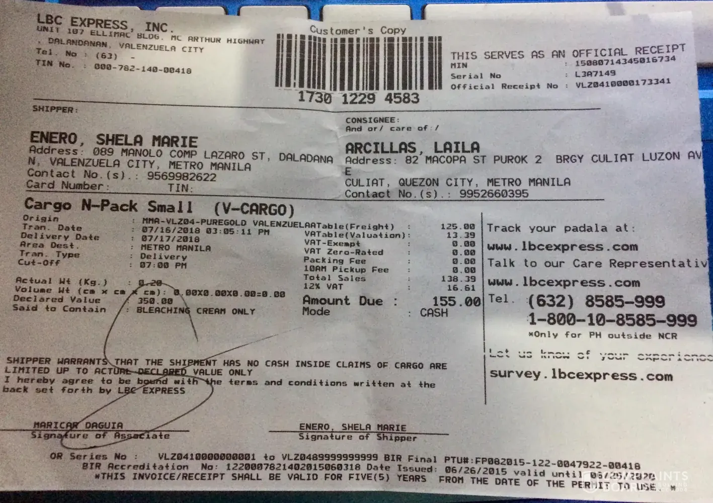 July 16, 2018 nung ipinadala q s LBC valenzuela branch near puregold valenzuela ung parcel VALENZUELA to Q.C. lng but until now lapit n mag-august wala p dn! mas nauna p ung ipinadala q s cebu 3 days lng nsa house n nla eh e2ng Q.C. lng $* years n wala p dn nkakarating! ano bng problema nyo LBC?! pde pkiayos toh! nkakapikon n kau! ilang beses n tong nangyayari sakin huh!