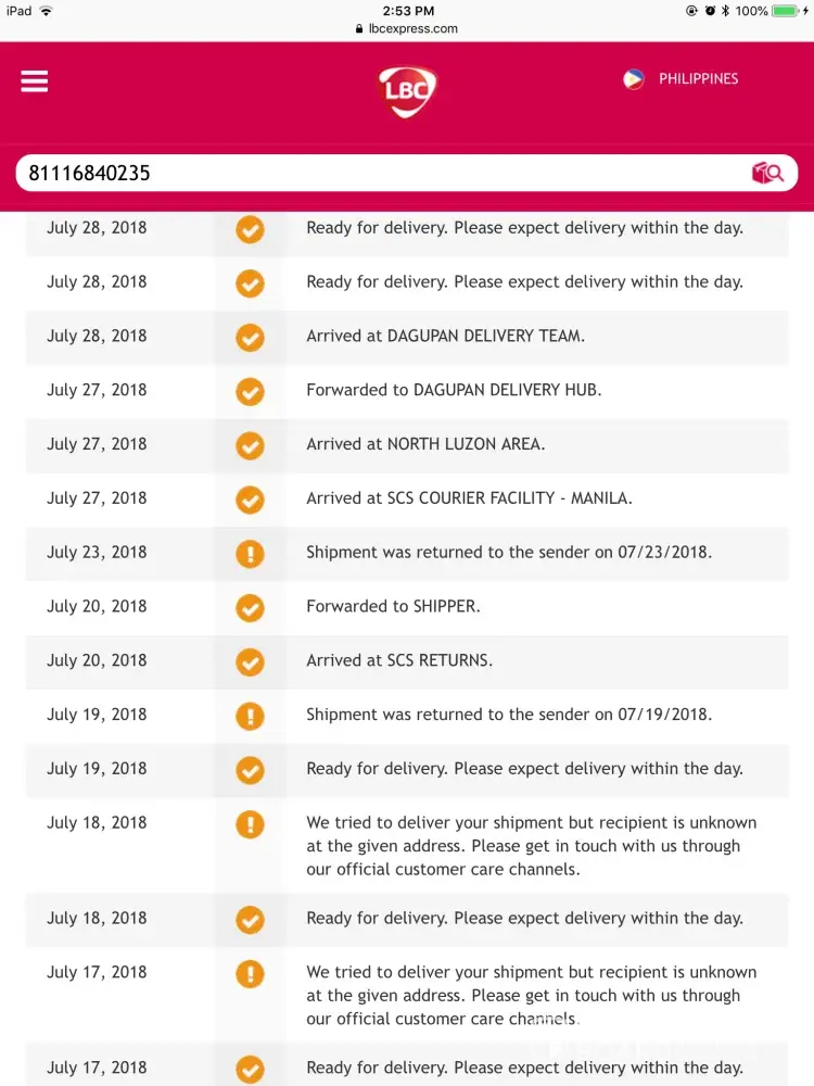 july 9, 2018 nagpadala ako ng letter sa papa ko sa nueva ecija. july 11 di pa nareceive so i tracked it down. tapos sa remarks ng tracking nila eh "the recipient is unknown in the given address" may contact no. naman na nakasulat don bakit di nila tawagan...di kaya eto ang first time na nagpadala sa address na yon at nakakarating naman yong dating pinadala. until now. july 21, 2018 na di pa rin nakakarating ang sulat na pinadala sa lbc. cabanatuan delivery team. alam niyo ba ang ginagawa niyo? sop nman yon diba na tatawagan ang recipient kung di niyo mahanap ang address. please naman ideliver niyo na ang sulat...walang lamang pera yon. di pla mapagkakatiwalaan ang lbc kung ganun...sa lbc express. siguraduhon niyo naman na competent mga kinukuha niyong tao. anung balak niyo sa sulat na pinadala ko...eto tracking no. please lang lbc...look into this matter. [protected].