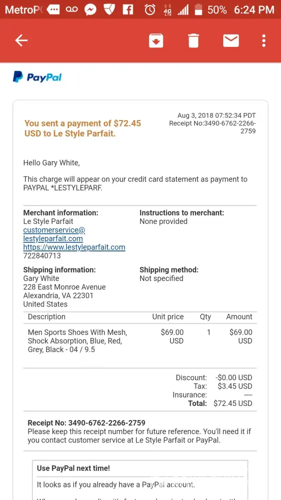 I sent my payment through PayPal to purchase some Men's Sports Shoe's on August 3, 2018 and emailed Francisca going on a month who continuously said that my shoes will be here in a week, but still now September 21, 2018, I haven't received anything!How did you go about getting your situation resolved?